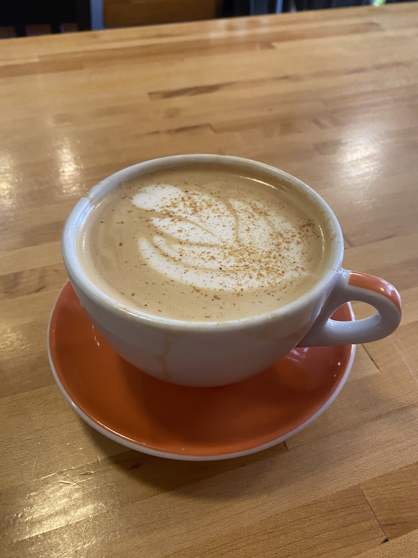 (9/18/23) The latte I ordered took 10 minutes to come out, even though the shop was not busy at all and there were 3 baristas talking the entire time. My drink had dried espresso running down both sides of the cup, which I noticed after picking up the mug when the plate slammed back down onto the table because it was stuck to crusted espresso underneath it as well. My pictures show the drink before my first sip, and after the plate dropped and I looked closely. As a former 3rd-wave barista, espresso can and does run over the cup lip easily, but it’s your responsibility to clean it up before serving. I am not sure how this was overlooked, again, as they were in no apparent rush.