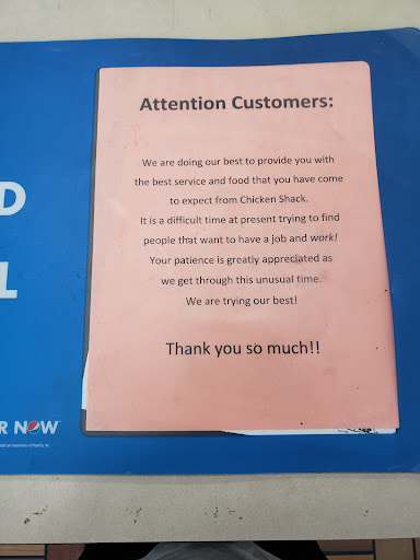 Read moreFirst time i have been to this location. My boyfriend and i dined in and we placed seperate orders. The time on our receipt read 6:40pm which was about right. I get my food at 7pm. They start to get busy, it is now 7:10pm and he goes to check on it. They tell him another 5-7 minutes.At 7:20 he goes up there to check on it, they say "sir wr will have your chicken snack for you in a few minutes and for the inconvience we are giving you a dinner instead". So my boyfriend replies " i had the chicken sandwich " and the guy says "ok, we will give you an extra cole slaw". At 7:30pm they bring his sanwich out with potatoes instead fries ( i acutally made a bet with him saying they would do that. Thats the funny part). So at 7:33 pm we recieve our fries. What kills me is multiple people came in and PLACED to go orders, with chicken sandwiches..chicken dinners and they all got theirs before us. This was such a joke. To top it off we didnt even recieve the "free" coleslaw we were offered. I dont know which one of those clowns were the manager, but the whole crew did not work well under the tad bit of pressure...