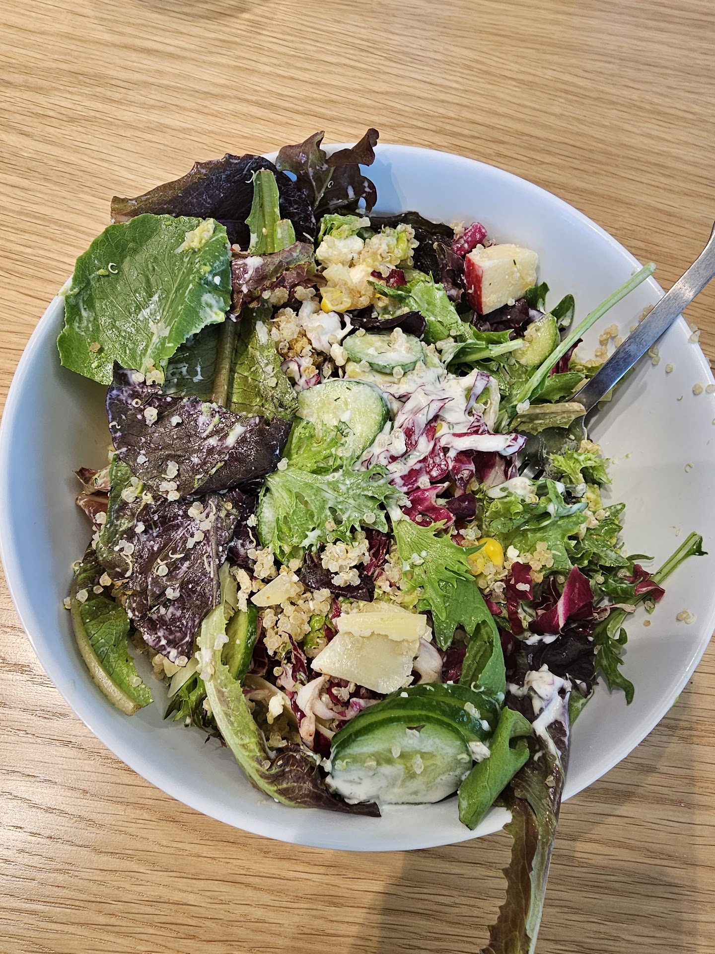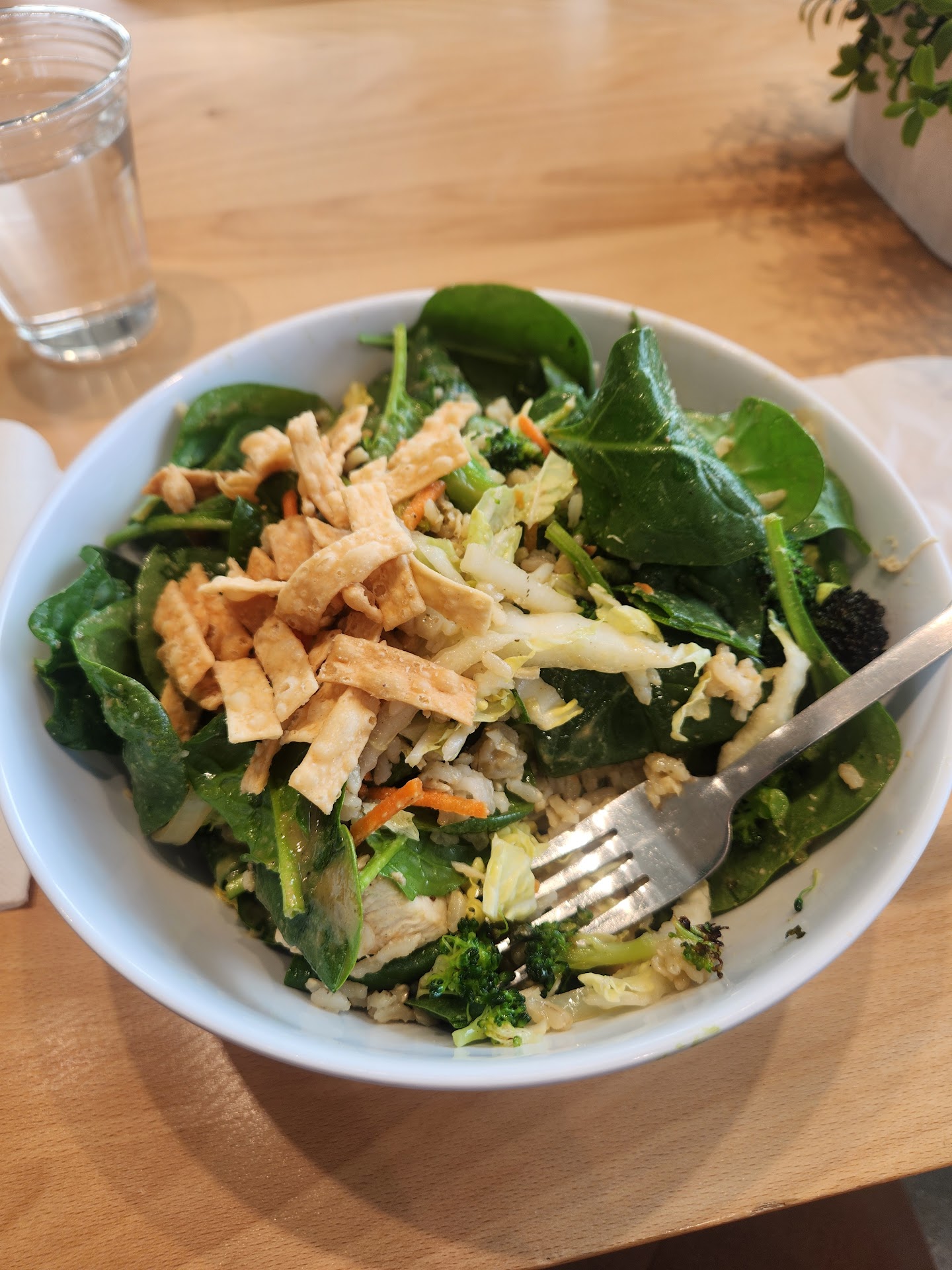 The salads and bowls I have eaten have always had predictably fresh ingredients, with amazing flavors. I am a "Greek Out!" junkie now but have also had 8 other salads or grain bowls and each one is filled with fabulous taste bud joy! Every time I order, I get the same fresh and yummy ingredients, no matter the time of day! I also love that if I am not "feeling" a certain topping that day, I have the option of leaving it off and adding another. It really is like having your own salad creator without all the cost of time and money of getting to the store, buying all your ingredients, and then cooking up, seasoning, and prepping it all! The prices are reasonable for such a feat! They even add on some free and generous amts of chips/bread/crunchies, as a bonus!