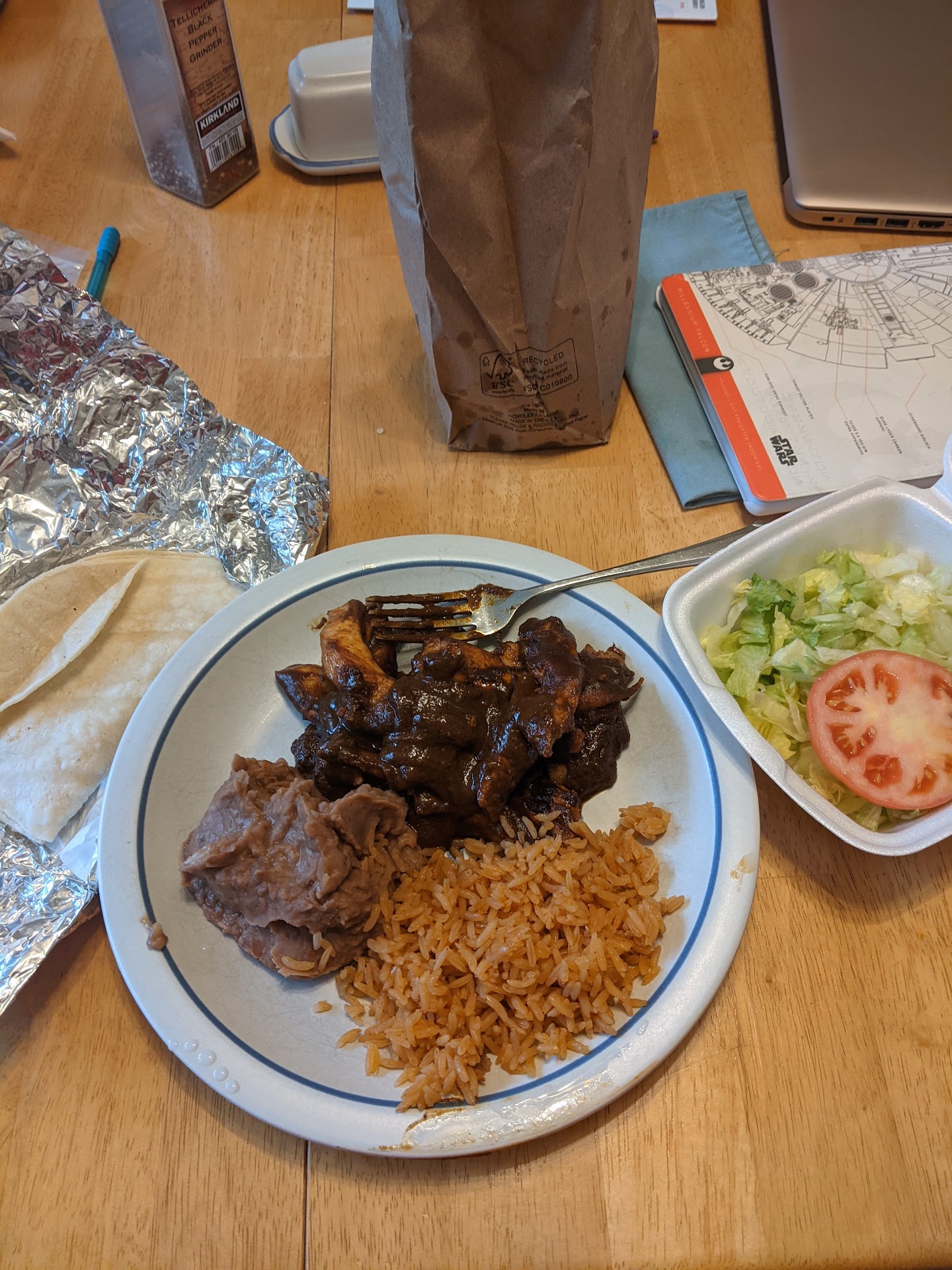 I really like the food here. But it seems quite expensive, for what it is. The chicken con molé that I got, that I've added a photo of here, was all but $19. It's very good, but that is very expensive if you are looking to feed a family at $20 a piece. That's with no drink or anything and a few fresh Tortilla Chips in the brown paper bag. They also use styrofoam takeout containers. The reason it is all on a plate is because the styrofoam container basically came open in the bag when we were walking home, and mole sauce was all over the inside of the bag. They add a charge for takeout, and the current incarnation of menufy that they seem to be having is inflexible and misleading. For example, it said I could add ONE 'extra' only, that was it -- and that included either paying extra for sour team or guacamole, etc. OR asking for no tomatoes or green peppers or onions, or anything. Yes, there is a space to our additional info about allergies, but really? I can only ask for source cream or guacamole, but not both? And the app didn't even tell them right, what I wanted. We walked in, and they were about to call me to specify what I actually wanted. Because they had no idea. I had to wait around for 10-15 minutes, and pay literally twice what I had ordered was listed as in the menufy app. Take out is what kept them in business during this whole pandemic -- and honestly, why we have ordered from them in the past year -- and as far as I can recall, this added charge for takeout is a new thing. It's not for delivery: I'm still going to get it, taking it home and plating it, and don't even want plastic dinnerware or anything. I even have to reheat it at home if I want it hot. I'd the food wasn't so good, I wouldn't have even given four stars due to all the trouble with ordering take out. It's a good place, I hope they get the takeout order issues...