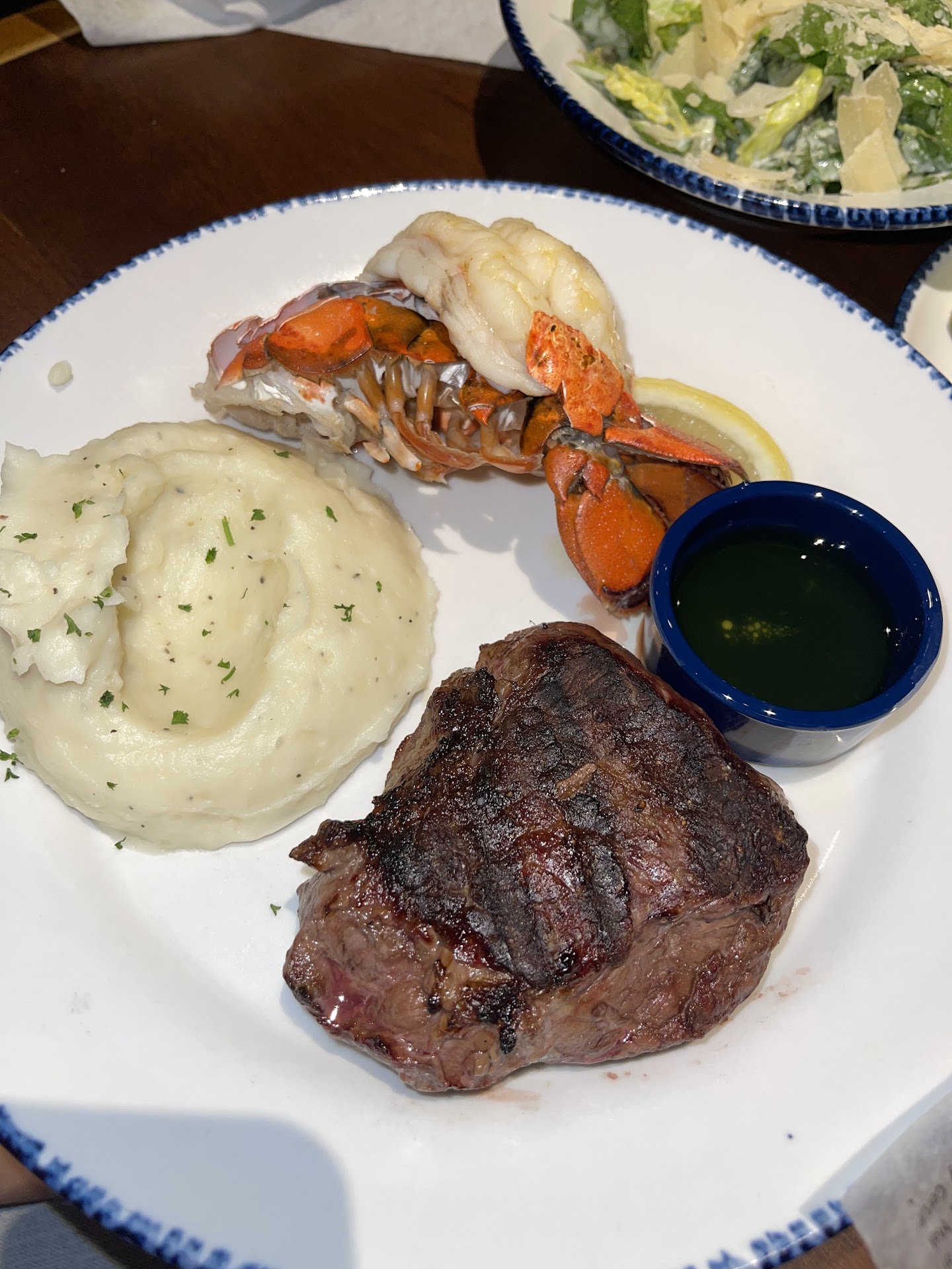 We ordered the steak and shrimp special for $30, fried kalamari and a couple side salads. I ordered medium and my gf ordered medium well. After a while the appetizer came which I was surprised about. The kalamari was no rubbery and the dipping sauce was really good. Once the entrees came out my gfs was swimming in blood (clearly not medium well). So after finally getting someone’s attention they took back the meal to cook a new steak, new mash and new lobster. Her food didn’t come out until I was almost done with mine. Defeats the whole purpose of eating together. The manager did bring out there refire, but didn’t offer an apology for the mistake, the wait, literally nothing. We were so disappointed in the flavors of the food it bummed out the whole experience.