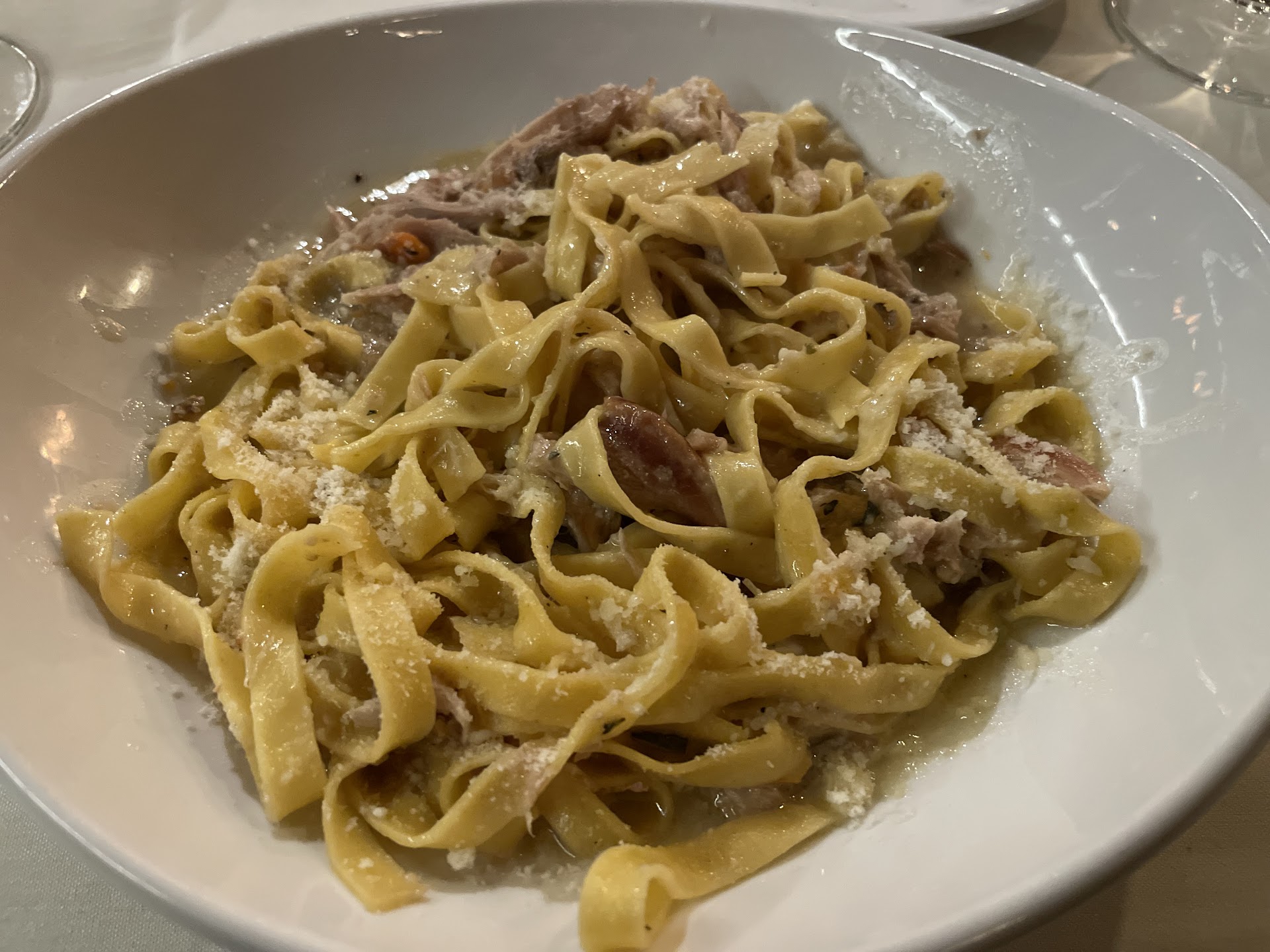 Good food but not amazing, service needs some work. Here’s an honest review. First time dining here. Had a reservation for 8:30, got seated early and opted for the outdoor patio, very beautiful view of river and you could hear it going by which was nice. Ordered 2 appetizers, one was good and the other (scallops) was amazing, probably one of the best scallop dishes we have had. For entrees we ordered 2 of the freshly made pastas, they were good but by no means mind blowing. I ordered the rabbit fettuccini and was very disappointed to have found 3 bones, 2 of them fairly large and 2 other pieces of hard tendon or cartilage. With a rustic dish like that maybe 1 small bone would be able to be looked past, but the size and quantity of them for this caliper restaurant was a pretty big disappointment. It wasn’t enjoyable to take each bite and fish around feeling for bones. I had them set aside and the waiter noticed them (I didn’t complain to him about it or even menrtion it) and he comped our dessert at the end which was a nice gesture. The dessert we got was the chocolate molten cake, it was very good. I also ordered a glass of wine with my dish based on the waiters recommendation and it paired very nicely. The busser who clears dishes as you eat and refilled waters walked past me 4 times with an empty water glass right on the edge of the table and never filled it, and he looked right at it. He finally made some rounds with water, ran out at the table before ours, and then skipped our table to get a bottle of sparkiling water for newly sat table and never came back to finish filling the other tables waters. I had to finally ask him for water. That kind of thing is unacceptable when spending decent money at a place like this. I heard the table across making some similar comments about both the waiter and the busser not being very attentive. Same with our waiter, he did ok but definitely not great with attentiveness. Maybe they were short staffed on the patio, but again at certain calibers of restaurants you expect a certain level of service. Leaving an empty water for 15 minutes is just not acceptable and should never happen with a properly trained staff. 2x during the service we had someone try to deliver dishes to us that we did not order, again not typical for a well trained staff at an upscale place. Also we were never offered or given a bread basket which it seemed the tables around us had, again another little thing but all these mistakes would not be expected for a nicer place. Overall I would come back and definitely want to sit on the patio again as the atmosphere by the river was one of the highlights. Food was good but not amazing other than the scallops and dessert, so next time we will try other main courses. Hopefully the service errors was just a bad night for them and won’t happen next time, we will give them another...