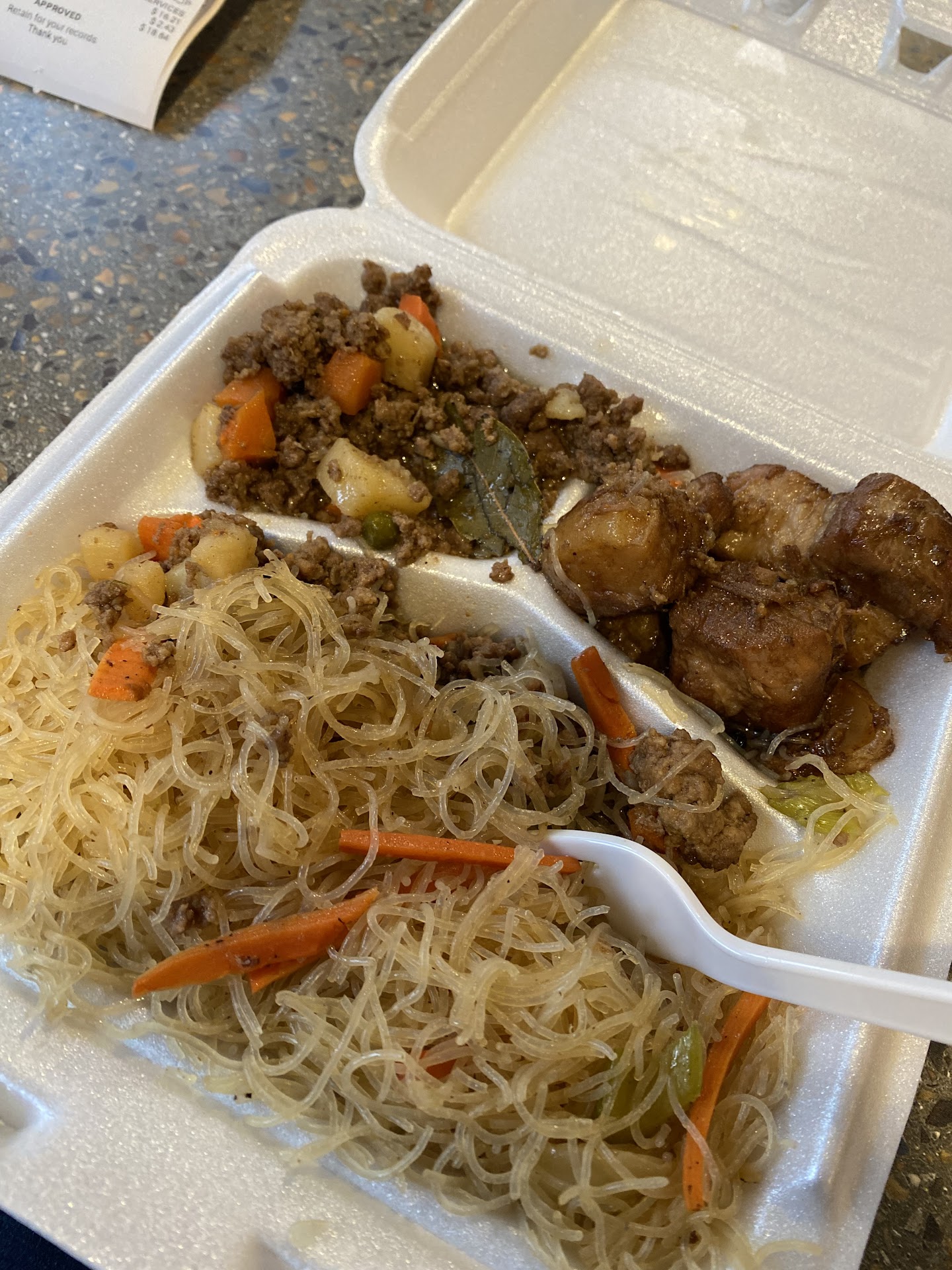 Letâs start with the Pork Adobo: (Soy-Vinegar based Braised Pork Belly served over Rice). This Adobo is rich in umami, the pork belly melts in your mouth as it releases the flavor it stores from the meat. I can tell that this Adobo has been slow cooked and marinated for at least 6-8 hours. This is the absolute gem of Filipino cooking/flavor. This is the dish that most Filipinos serve people whoâve never had Filipino food- so if youâre one of those people- DEFINITELY get this dish!