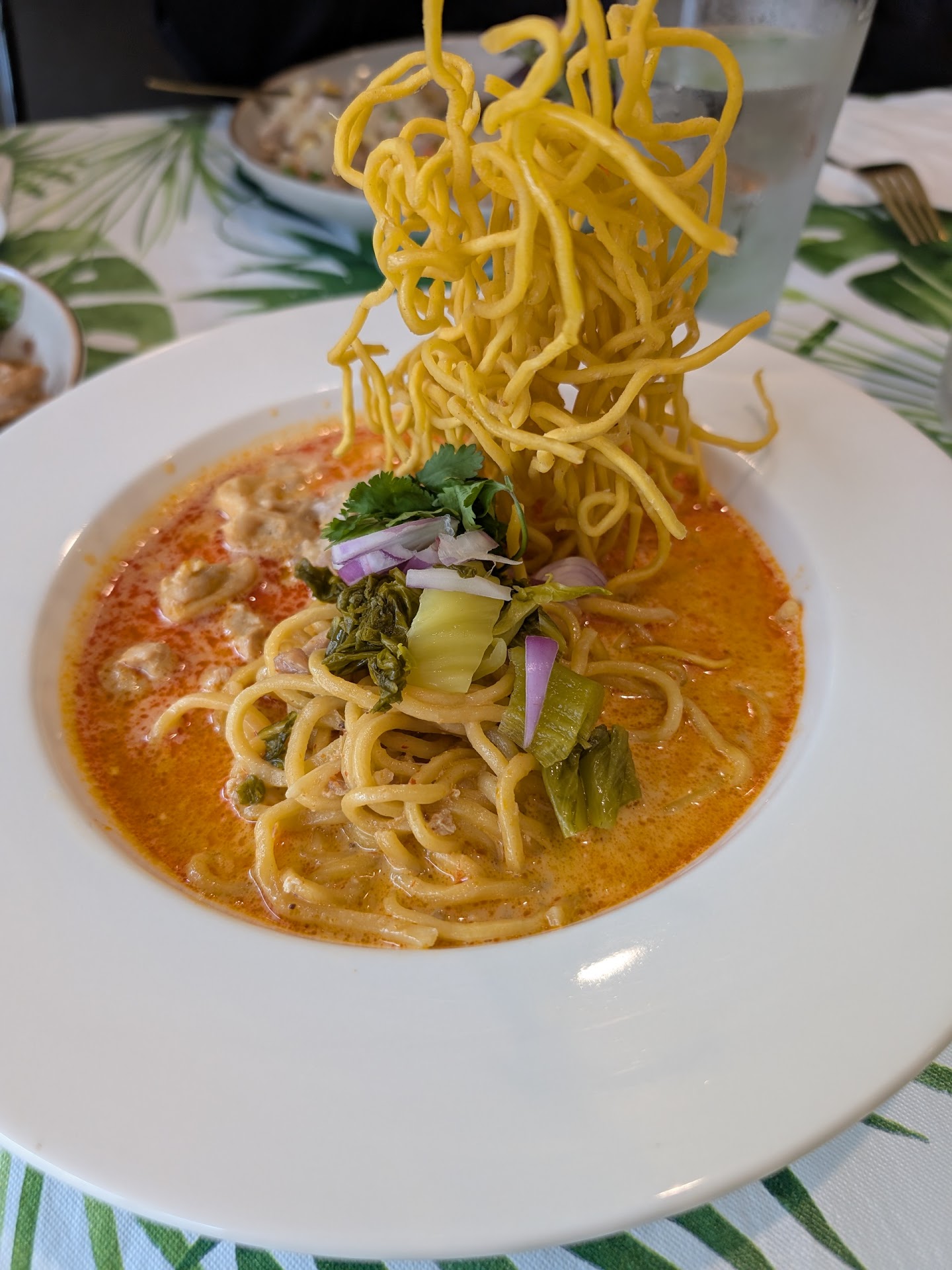 We both got the chicken massaman curry. The veggies in it were severely undercooked. Crunchy. (The potatoes, carrots, and onions). The chicken was nearly inedible. It was chewey, grizzly, and was in odd unappetizing pieces. Additionally, the potatoes were served in 2 really big pieces which is not my preference for a dish like this, I’d much rather it be smaller pieces. Then maybe it’d be better cooked as well. The flavor of the sauce was good. The sauce, however, was so thin/runny that it didn’t coat any of the items once you actually take it out of the bowl. Looked more like the consistency of a broth for a soup than that of a curry dish. So was unable to get all the flavor of the sauce that I maybe would have been able to. Portion seemed small for what we paid. (Especially considering there were only two small pieces of carrot. Could have used a lot more veggies.)