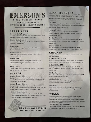 Read moreAbsolutely phenomenal food and service! We had pizza, wings and we split a burger. We wanted to try it all. It was so good that we TOTALLY forgot to take pictures! Next time!! Customer service was impeccable!! A full crowd and yet it was noticed by the owner our food took a little long to get to us. We never mentioned it. Our waitress Ellie, (omg she is a doll and a FANTASTIC ATTENTIVE WAITRESS!!! ) came and said our entire ticket was on the house!! Like what!? I love a business that truly puts their customers 1st!!! If u like fresh, hot, cooked to order, GREAT tasting FOOD & AMAZING SERVICE... Dont sleep on this place...VISIT EMERSONS!!!...