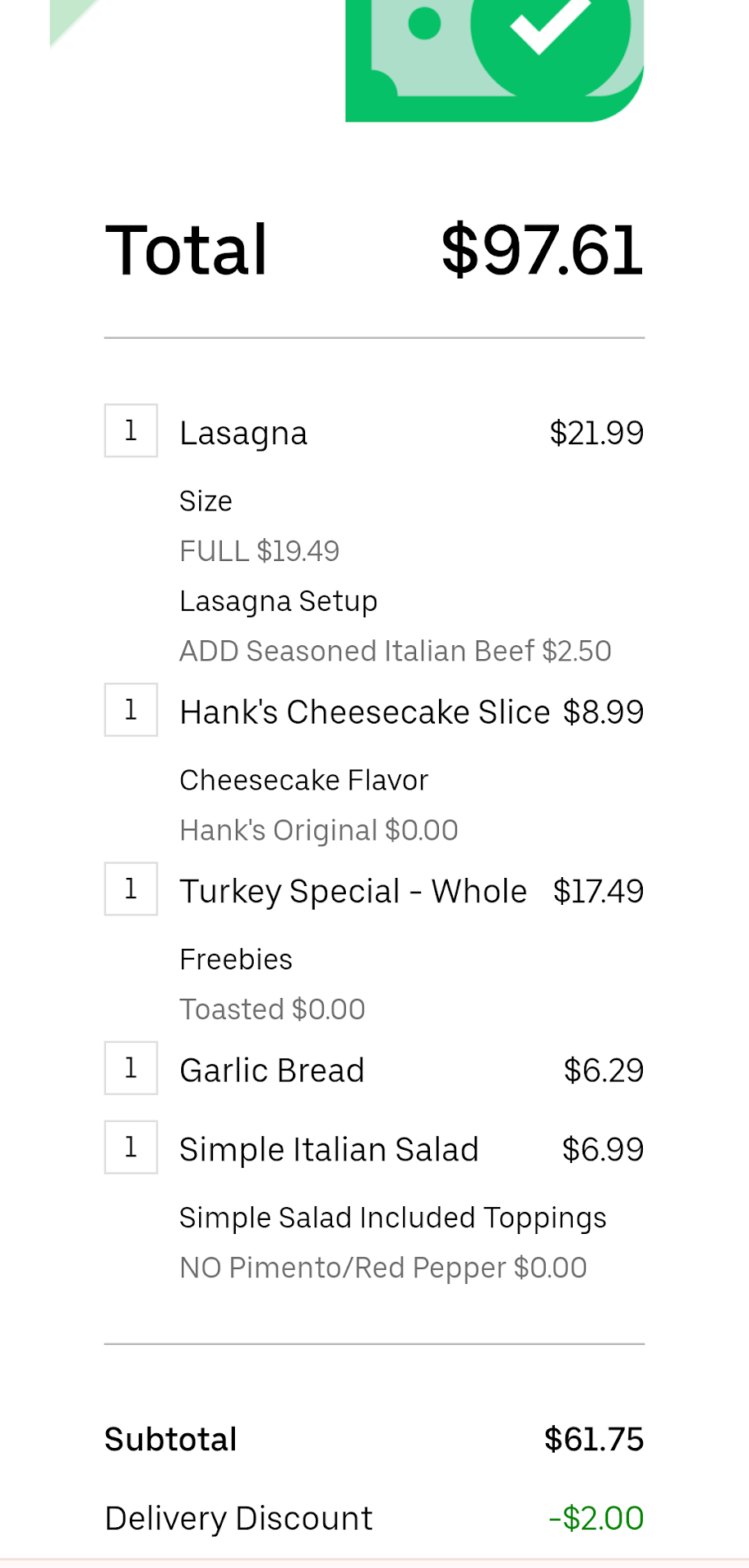 Ā Ā Ā Read moreI have been in Saint Louis all my life but I had never heard of this place, but one night I was so hungry and was craving lasagna (my FAVORITE meal šš) so I decided to get on Uber eats late at night about 10 or 11 and see what places served lasagna, that is when I ran. Into this place and decided to give it a try. I ordered lasagna, salad and garlic bread for me along with a cheesecake. I ordered a sandwich for someone else. When I got my order, the food was cold, including the lasagna. The garlic bread was the worst I had EVER tasted. It is as if the garlic bread WAS NOT toasted at all. It was soggy, lacked a garlic flavor and all I tasted was drenched butter. Omg it was horrible. I took a few bites and threw the entire thing in the trash The lasagna was cold. It had a slight flavor but the the thing I couldn't get over is it was dry and cold. (Pasta House has better lasagna especially if you like a saucy lasagna and sweet šš). The salad lacked any substance it was plain and I just wasn't impressed at all. Now, the cheesecake was scrumptious. I ordered a plain cheesecake. I didn't have the sandwich for myself, but the person that I did order the sandwich for, they said that they liked it. I did not take a pic of the food itself, but I wish I would have. Omg. I was really disappointed with this and spend over a $100 dollars on Uber Eats due to the price shown here but also giving my Uber Eats driver a $20 cash tip in addition to the...