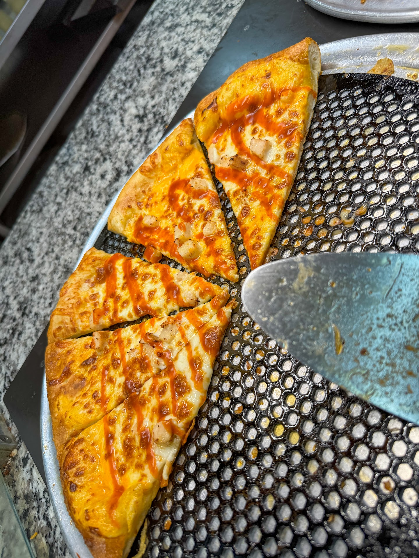 At this point I’m grossed out to the max and I then notice an employee leave the store and talk to another employee out front. During this exchange she rubbed her hands all over her face and scratched her scalp a few times. After a while she came back in and walked straight behind the prep area and started touching handles and food! Still no pizza at this point. It’s been 20mins.