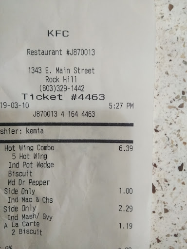Read moreThis was absolutely the worst restaurant experience I've had in my life. Get to the restaurant and there are two other individuals in line (not a problem). With 9+ employees you would think that at least one would be at the register (big problem). The customer first in line had to actually raise her voice and get someone to take her order (definitely not good). The reason she had to raise her voice wasn't because no one saw us in line. It was because the employees were cursing and talking about getting somebody's phone number (definitely a major issue). Then on top of that come to find out our cashier (name tag said Yumeika), was actually fixing a prior customers order. Not only did she finish preparing their food but she came to take our orders. That was great of her but not only did she do that but with at least 9 other employees there, she had to fix our food (at least someone cares about their jobs and KFC credibility). Just from observation there was 2 managers on duty, one was Jordan and a slender fair complexion young lady with glasses. Jordan was definitely not in control of the employees and his frustration was taken out on a customer that was returning some food. As she spoke to him, he wasn't even listening to the issue, he was trying initiate a solution to a problem he had no knowledge of. The young lady manager was too caught up in the conversation about phone numbers that she could care less about customer service. While I sat there and ate, she left, so I'm guessing going home and socializing was far more important than KFC. There was so much wrong in the scope of CUSTOMER SERVICE and...