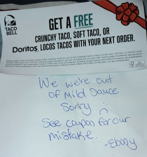 Read moreI visited this location the night of 1/18/25 with my friends & we placed 3 small mobile orders. After receiving our orders at the drive thru, we pulled over in the parking lot to eat. When we opened our bags, we noticed items were missing on 1 of the orders & after biting into burritos on our other 2 orders, we realized they were the wrong burritos. My friend had to go to the door twice... once to explain items were missing & the second time to explain we got the wrong food. Once our "corrected" orders were replaced, we realized that they still had some items incorrect. We had to pull back through the drive-thru to get the order corrected again. My "corrected" order included a bean burrito with extra cheese & red sauce & a crispy cantina chicken taco. The bean burrito had about an entire cup of onions in it & my crispy chicken taco only had a few pieces of chicken on one side of the taco. All of our food was cold, dry, & unappetizing. See attached photos just of my bean burrito & chicken taco for reference (not including everyone else's orders). I guess what I simply can not comprehend is the fact that all 3 of our orders were mobile orders, so the order pops up on their screen exactly as it was ordered. It's not like a verbal order that was misunderstood. I know we live in a day where "we listen & we don't judge" & I'm not the type of person to post negative reviews but do better Taco Bell on Anderson Road!! I will never return to this location again & I'm a Taco Bell lover. I will say this was reported to corporate & they did resolve the issue with refunds, but it was a...
