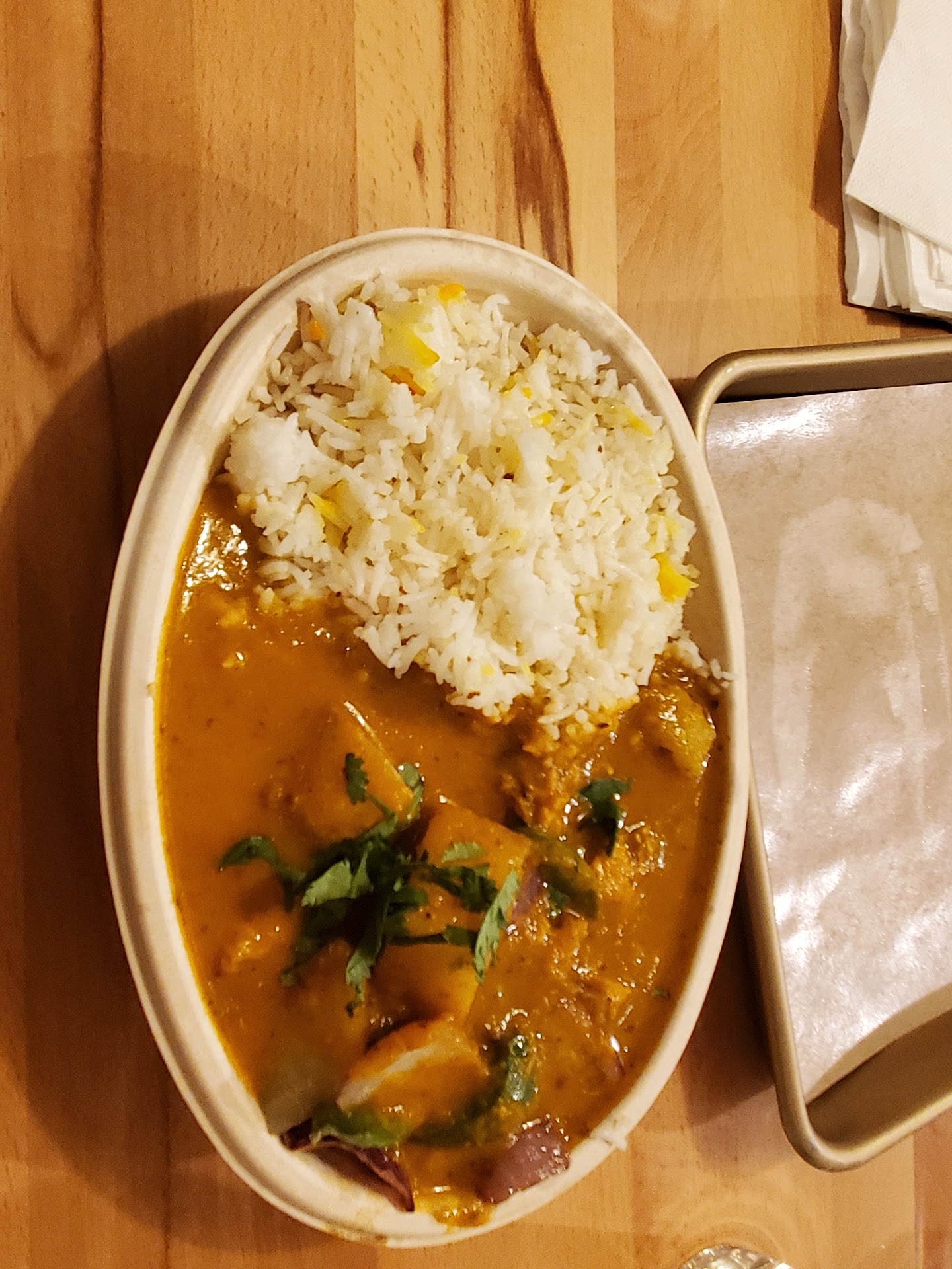 Ā Ā Ā Read moreWe came here for the first time and the atmosphere was nice. The food was good, it had a nice spice level to it. Ordered from the menu and I had like a potatoes chicken curry dish like a Goya and it was more earthy then the butter curry that my husband had ordered which was butter Masala. The garlic Naan was really good would make a perfect pizza. We came with a party of four. The wait time for us wasn't but like 10 minutes but saw other parties waiting on a Friday evening which restaurant seemed to only be busy with to go orders. The only thing I would say is portion sizes are small and alot of rice versus protein, and the containers they serve it in tend to soak up the curry sauce so you better eat fast. Will be back but only if eating...