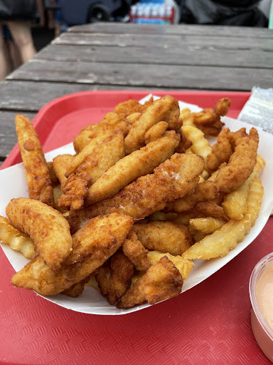 We arrived on foot, skirting the edge of a cartoonishly cinematic mini-golf course. The menu was posted on a board at street levelâbrief, confident, and laminated against time. Old Glory waved above it all, not as a political statement, but as a weathered given. Inside the open-air corridor, picnic benches claimed their own tiny nations of ketchup and vinegar, while a case of smoked fish and a row of hardworking deep fryers framed the passage to the counter.