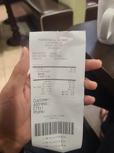 Read moreComing up to North Jersey several times the past few years I have always seen the sign along I-80 for the Hibernia Diner and thought that one day I would have to stop in and see how they were. This past week I was once again in the area but wanted to check out all my options so I of course checked the Google reviews of about 5 or 6 places and had narrowed it down to two different ones and since the other would have been during the breakfast time frame and I wanted lunch I decided to go to Hibernia. The other favorable reviews were accurate that it is in fact a friendly eatery with from what I saw people who make you feel like they are glad you stopped in. The diner was clean and the tables comfortable however I thought the prices of the meals were just a little on the high side but then I am basing that on South Jersey Diners so I don't know what this area costs to live in but I'm guessing it too is high. On the plus side though the size of the meal was such that I was able to return home with leftovers that were enough for a lunch meal the following day, a meal that actually tasted a little better than when I first ate it. Check out my comments in the pictures for...