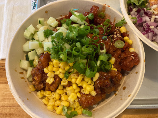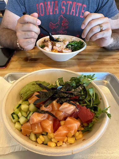 I came here on a Friday night to check out this newly opened spot. They've been open for a few months, Jan 2022. First walk in, the restaurant was clean and there was a seating/dining area off to the left. On the right, you'll find the poke bowl bar and you head to the back of the bar and make your way down towards the register. Their menu is displayed on screens on the wall and you can see all of their ingredients behind their glass barriers. There's "build you own" bowls or bowls that are preset for convenience. Based on their menu for the "build your own", you begin by choosing your base (rice, salad or zucchini noodles). Then, although protein is next in line, the server asked about other toppings first and stated the protein can go on after (for better presentation I guess). They have a good variety of toppings and protein to choose from (see photos). I did find it interesting that they offered some Chinese style protein (General Tso's chicken, Walnut shrimp) but I guess they're catering to those who may not like raw fish which is smart. I chose raw salmon and tuna and the quality was okay, not the most fresh I've had but decent. I recommend reading the menu first before adding toppings though because it's very easy to just point to all the different toppings you want and not realize that some have an additional cost (I had to pay an additional $1.50 for seaweed salad). Finally, you pick from a selection of sauces and "crunch" toppings. I tried the Wasabi mayo and I wasn't a fan of it, but who knows, you may like it? It wasn't overly spicy, just didn't taste like much. I usually like Wasabi too so I was disappointed. Overall, I was satisfied with my poke bowl, it was pretty tasty and filling. I couldn't finish mine and had to save it.