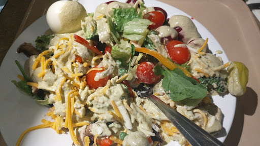 Read moreI was excited to have the salad bar. I knew they give everyone clean gloves to use when making their salad which was reassuring. However I noticed that the employee working the salad bar was not using sanitary procedures. She would take dirty plates from tables back to the bus area and scrape food off them. Then with the same gloves she had been wearing, go back to the salad bar and pick stray vegetable pieces out of the salad bar bowls. This would be like picking a stray piece of lettuce out of the cauliflower, or picking a stray olive out of the shredded cheese, etc.. She also would bus tables them go behind the counter and fix people's food with the same dirty gloves.