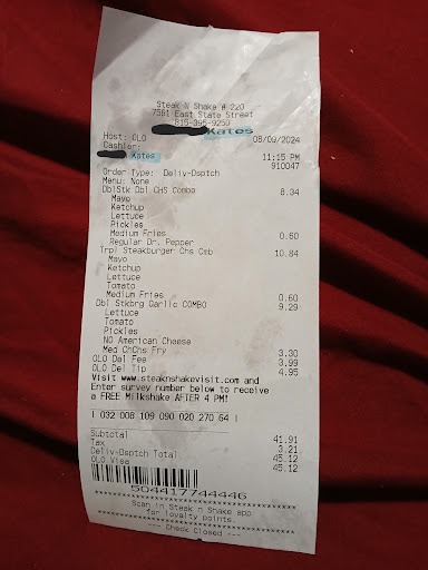 Read moreThis location has the worst customer service of any Steak N Shake I have been to by far not even joking. Now the only reason I go back is because it is convenient when staying in one the nearby hotels and the food is good( when not screwed up ex. Cold grilled cheese and it's the one place my kids can agree on. Their vhas been times we have waited 20 minutes just for a server to take our drink order and another 10 minutes to bring us said drinks and another 30-40 minutes to bring us our food order wich is rarely even correct. We attempted van online order this past weekend and that was a complete fail got to restaurant at the time I was told the order would be ready and when I got their they handed me someone else's order even though they knew the name on my order so low and behold waited almost 30 minutes to get " everything" it took an extra 10 minutes to make me 4 drinks. Now we had a fairly large order and the person that with me had checked the bag before we left but it was so jam packed we couldn't see everything that was in their so we went over the order with the person up front and were garenteed it was good to go so we finally leave then I get to come back 5 minutes later to get what was missing. Hopefully I will not have to return to this location...