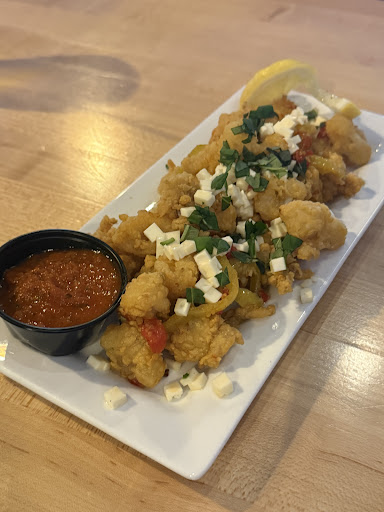 the food is decent but the menu feels pretty small, although somewhat diverse: burgers, sandwiches, fried seafood, some pasta dishes, salads, etc. definitely kid friendly in regard to the menu. admittedly i've only ever gotten fried clams and calamari here which i enjoyed, although every time i've got the calamari (3 times now) it seemed to come with a difference sauce (a spicy marinara, garlic aioli, or a lemon aioli -- if the owners are listening, the lemon aioli was the best of them!).