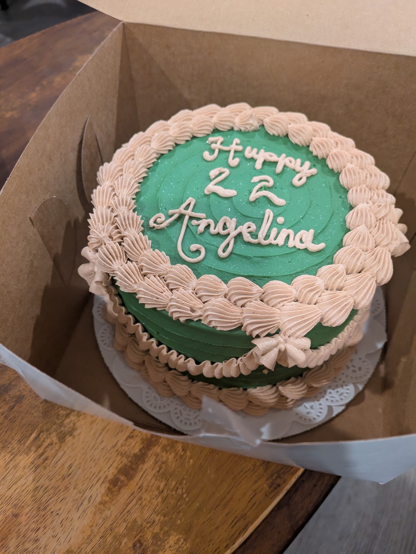 a little disappointed & heartbroken. I wanted to get myself a birthday it was to be green & white but when i initially got it. I was really happy until I took it home & looked closer. It's not white It is pink & when I called called to get help I was only offered a discount for ANOTHER Cake nor could they remake the cake . There cakes are good and i purchased before and that cake was amazing if you run into an issue with your cake, don't expect them to even reimburse or fix what they caused. thanks I guess really hope you offer better. Refunds or accomodations