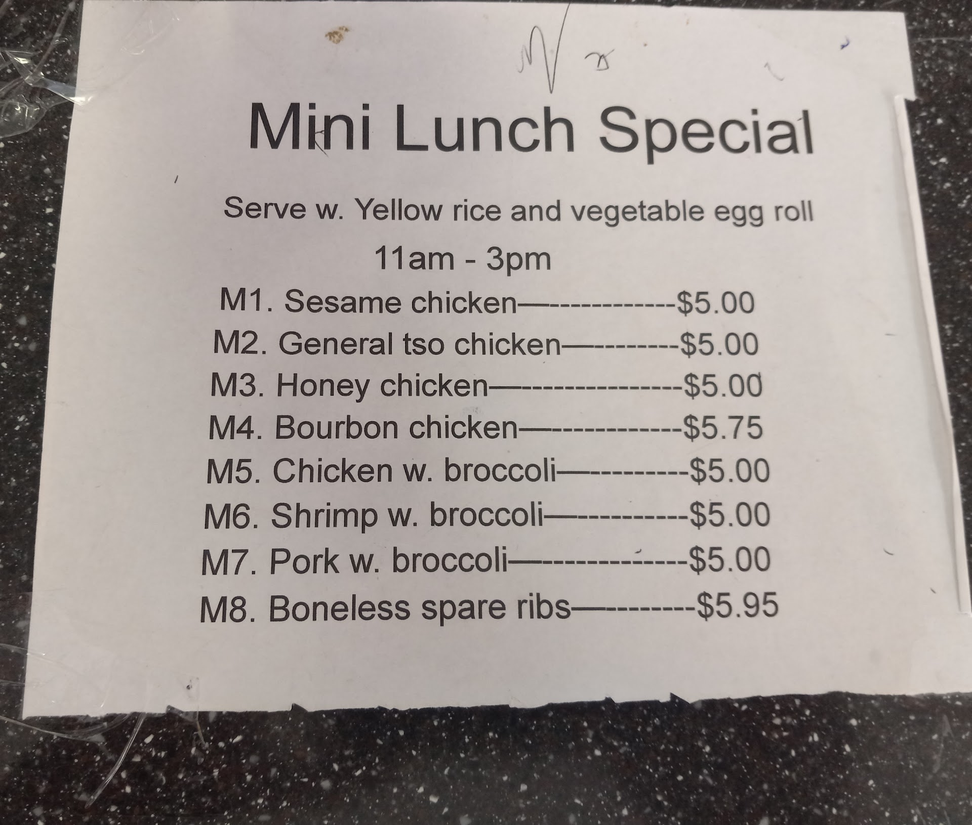 Read moreThis is my go-to delivery spot for Uber Eats and I want to give them a shout out because I think they consistently do a great job. They also have the best steam dumplings in the area with a thick dumpling wrapper. Really delicious. This dumpling really stands out from all of the others available in the area. Usually I order from here when I've had a long day at work and I'm just too tired to cook. The beef broccoli, chicken broccoli, bourbon chicken, boneless pork spare ribs, pork fried rice, and all of the soups are some of my Staples. The food is always hot and fresh and very reasonably priced. I highly recommend this restaurant if you're looking for simple basic Chinese American food. You will not find anything here that stands out as being Regional from any specific part of China but this is definitely catered to the American palate. Even still they do a very good job of that and are willing to accommodate...