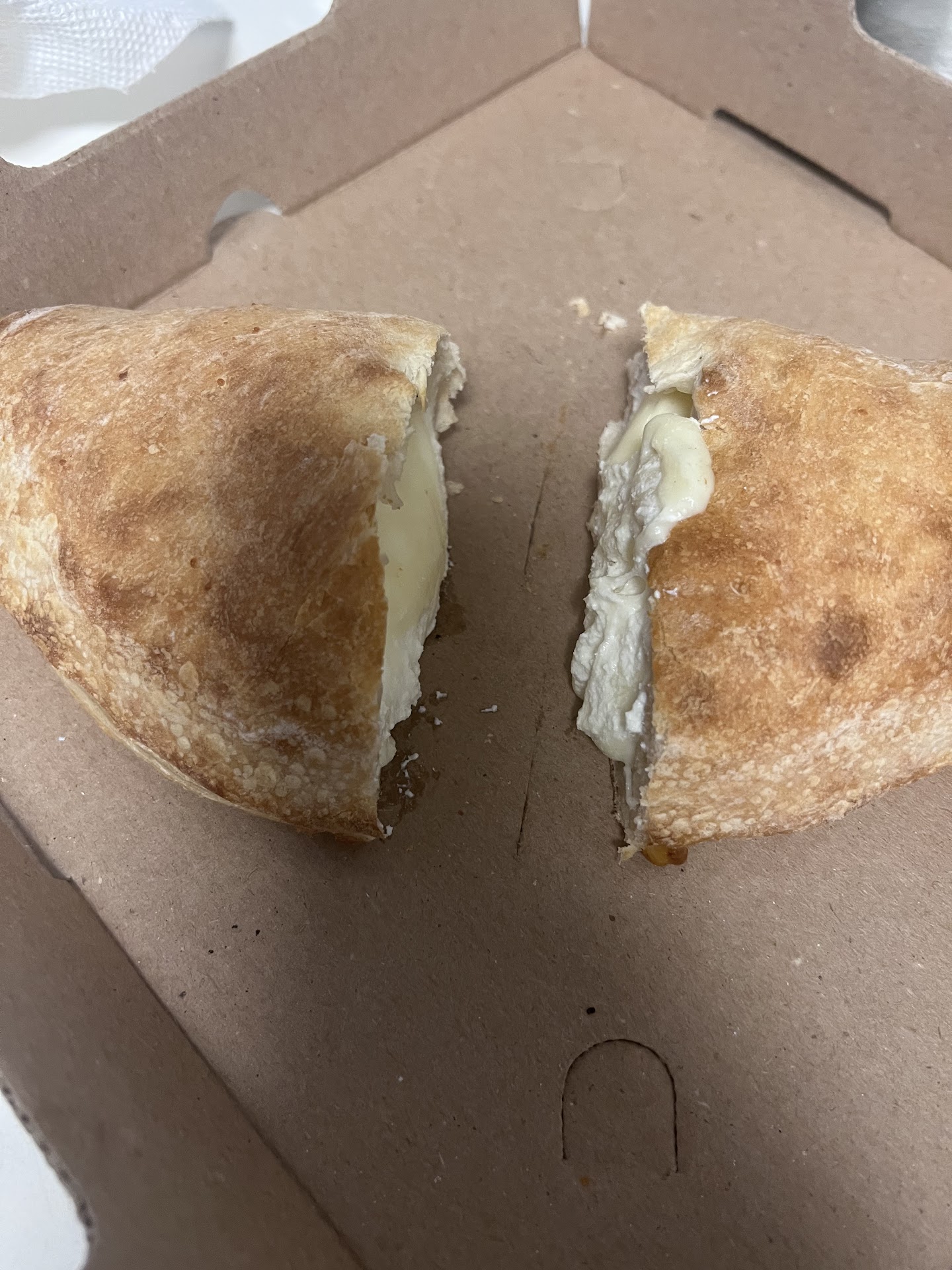 Read moreMediocre at best. We were excited to try a calzone and slice of cheesecake, but neither were impressive. No seasoning, garlic, oil, etc. on or in the the calzone, making it dry and bland. The cheese was still cool in the center. I’m attaching a photo of it cut in half to show no melting. The top part of the cheesecake was okay, but the bottom portion and “crust” were wet as if they were leftovers or had thawed.