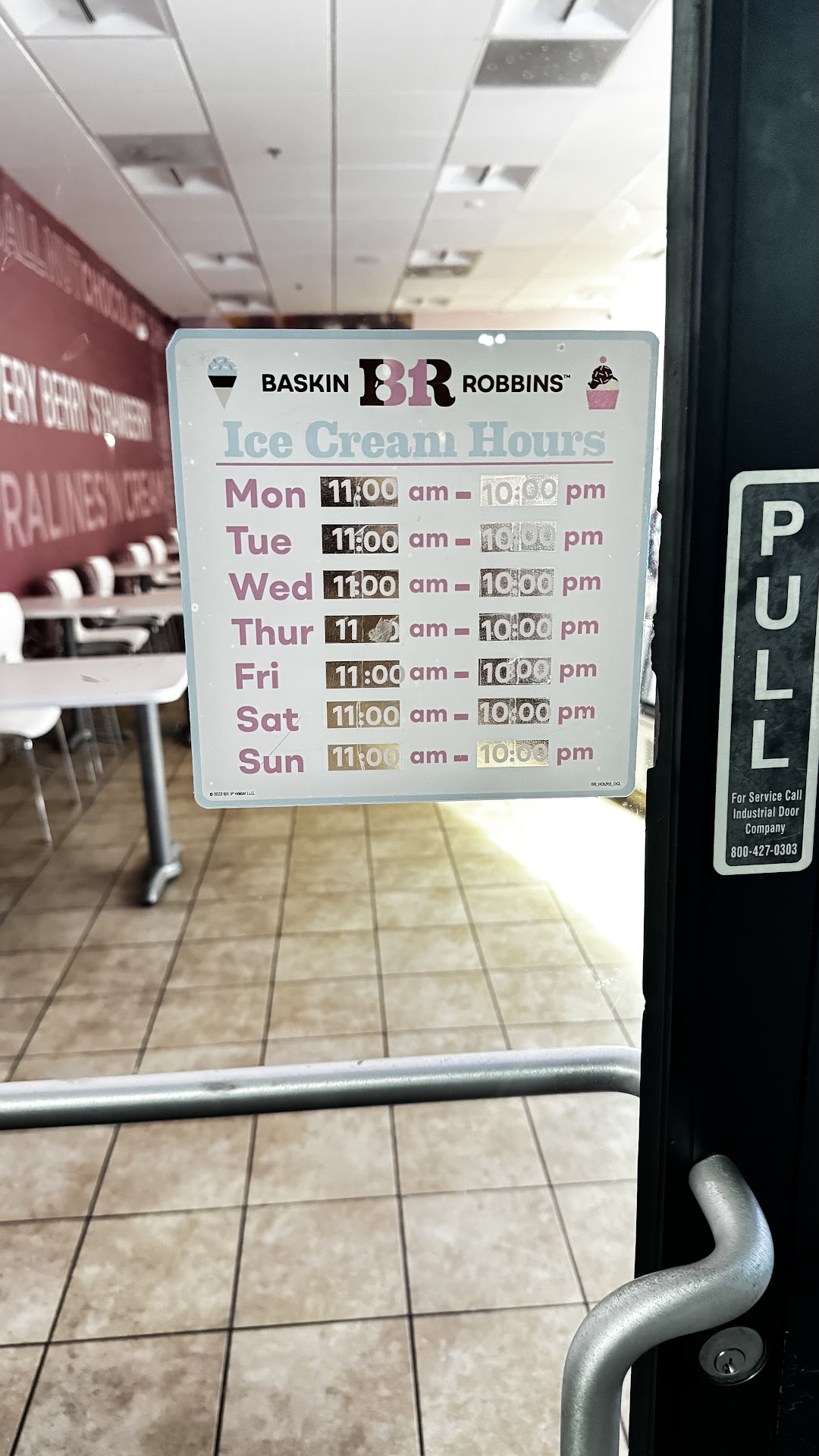 Read moreWorst experience at this baskin Robbin's location. Who ever is the lady there in the front was very rude!!! I accidentally dropped my ice cream cone on the counter. So I said," sorry I just dropped it on the counter. Can I please have a new one? The employee there was looking at this women with fear wondering what he should do and if it was actually ok to give me a new one! While waiting to get my new ice cream made, I asked for a napkin and was only given ONE to wipe my hands off. The woman kind of rolled her eyes at me and seemed annoyed. Body language says a lot. I used to come to this location all the time but customer service is more important than good food. Will not be coming...