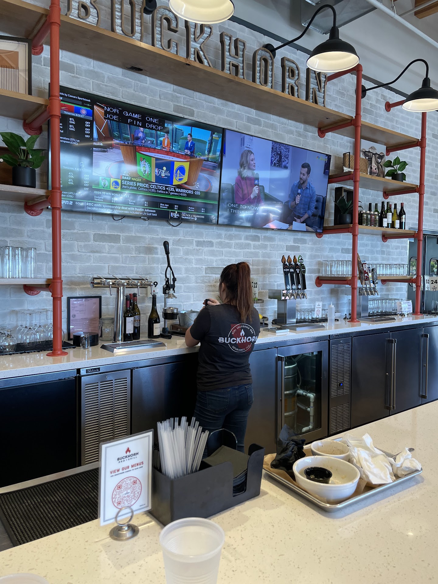 The building is in a great spot, right off the roundabout so people will see it, it has ample room indoors with a high vaulted ceiling, 2 huge TV's over the bar, great spacious seating inside and an awesome patio area for outdoor seating as well. Cute, Quaint, and Straight to the point. Everything was super clean when I visited to pick-up my order, and the wall to wall windows allowed a LOT of natural light to fill the building.