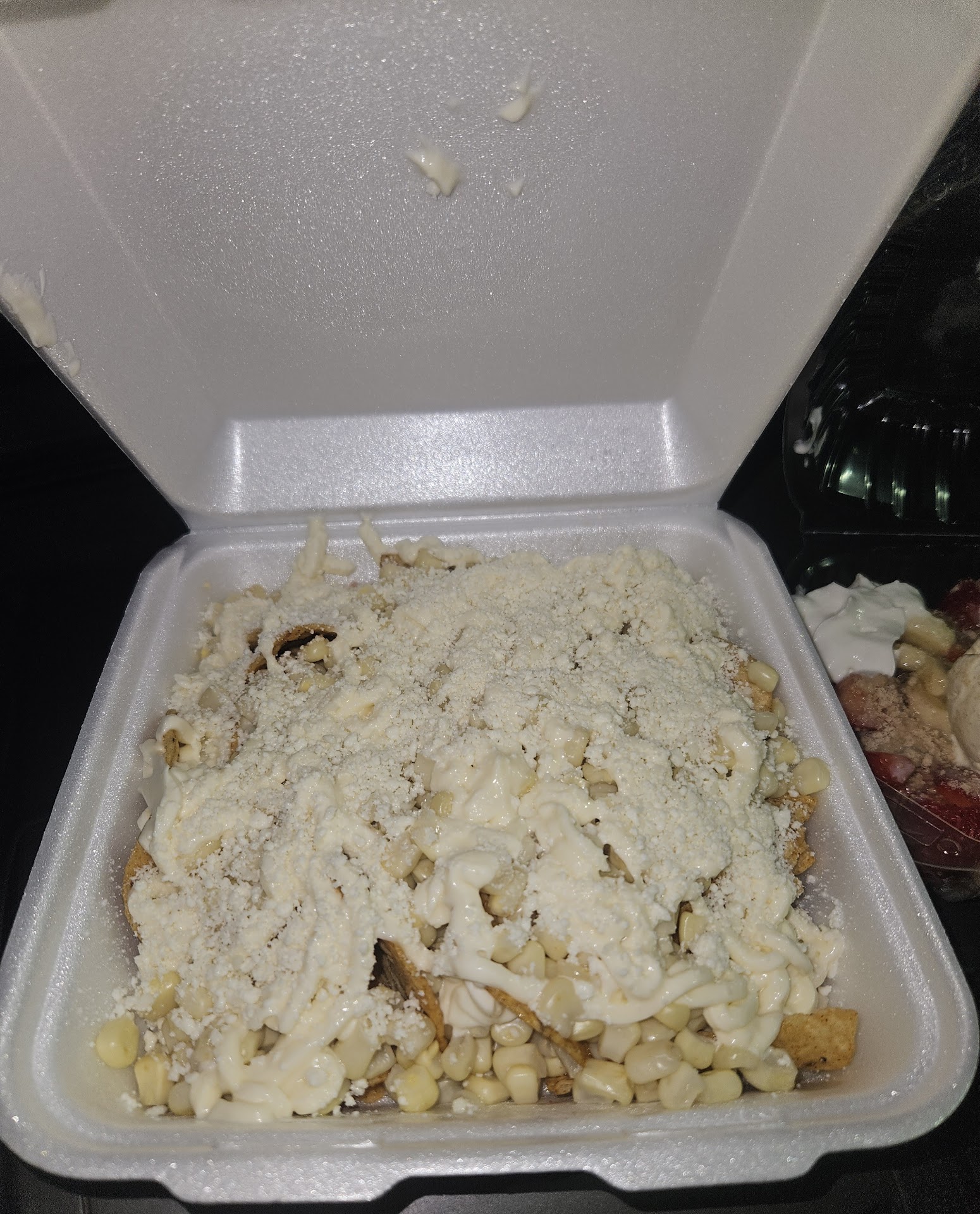 I had the Tostielote (Tostito chips, corn, mayo, cotija cheese, lime juice and Tajin) and the Munchies Special Minis (mini pancakes(?) with vanilla ice cream, powdered sugar, strawberries, bananas, whipped cream, lechera/sweetened condensed milk, and marzipan). I'll never eat elote the same again! Next time I'll be adding extra lime juice and Tajin 😋 Even with all the toppings, the Tostito chips were crispy and could easily scoop the toppings without breaking. The dessert item was delicious, but not too sweet. I liked that the little coin sized pancakes were warm, which melted the vanilla ice cream a bit. The food was very good and the staff was friendly. I will...