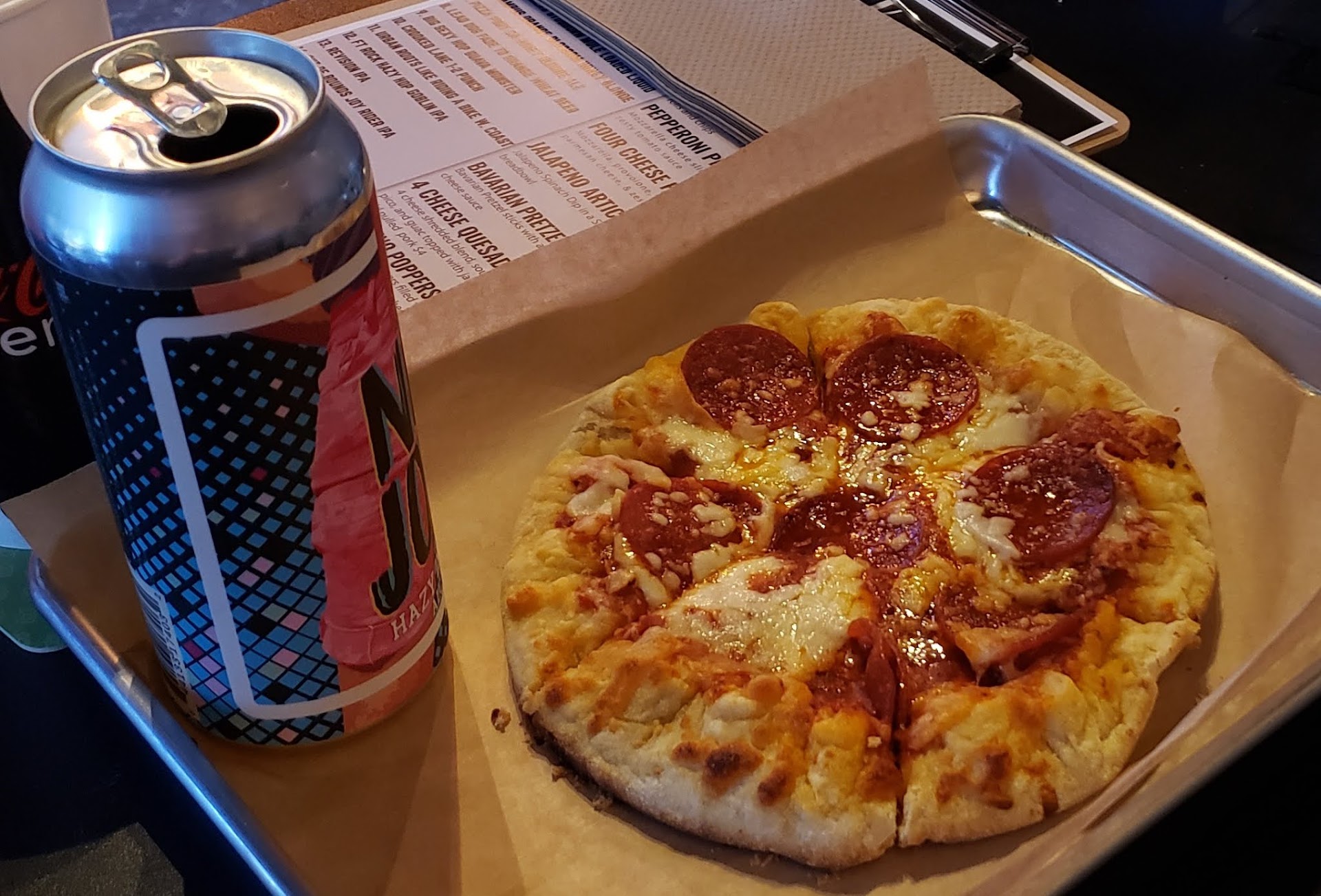 We ordered the pretzel sticks and a pepperoni pizza. I hate pretzels but they looked ok but are very likely frozen and the cheese I'm sure was generic style nacho cheese goo.