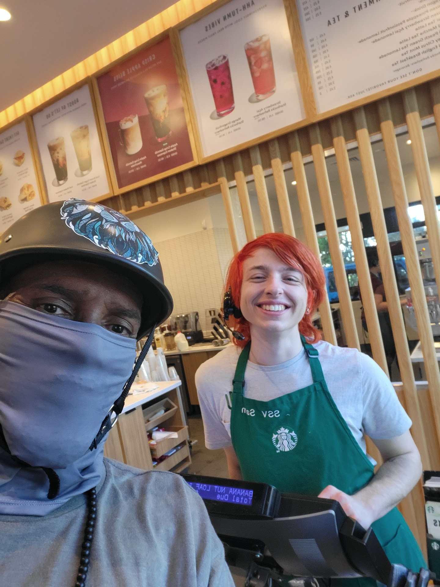 Read moreLong story short, I went 4 a rather long walk with mom n doggie Annie r.u.ok?. I left wallet home but I have most of the pay services. Went to local yogurt spot but they only had apple pay and where kind enough to give doggie Annie r.u.ok?, a yogurt cup of cold water. I told her my situation and tried to get a coke 4 me n mom. No go. Kept moving and tried the newly built star bucks. Who ever hired the young man and trained him I also wanna give cuddles too. He was pleasant knowledgeable and curtious. After a rather long attempt to use Samsung pay via PayPal, only to find out about new policies, you have to have money in PayPal system. No longer will they go thru your banking system if I'm describing correctly. The young man did a judgment call and or paid 4 my order his self, im not sure. But the point is I since his humanitarianism. Of course I explained my situation but he didn't have to pay it 4word if you will. Not a huge star bucks person but I'll go to this one just because. Thank you young man for helping hydrate and enjoy my walk with mom, and Annie r.u.ok?. Great hire Starbucks. ...