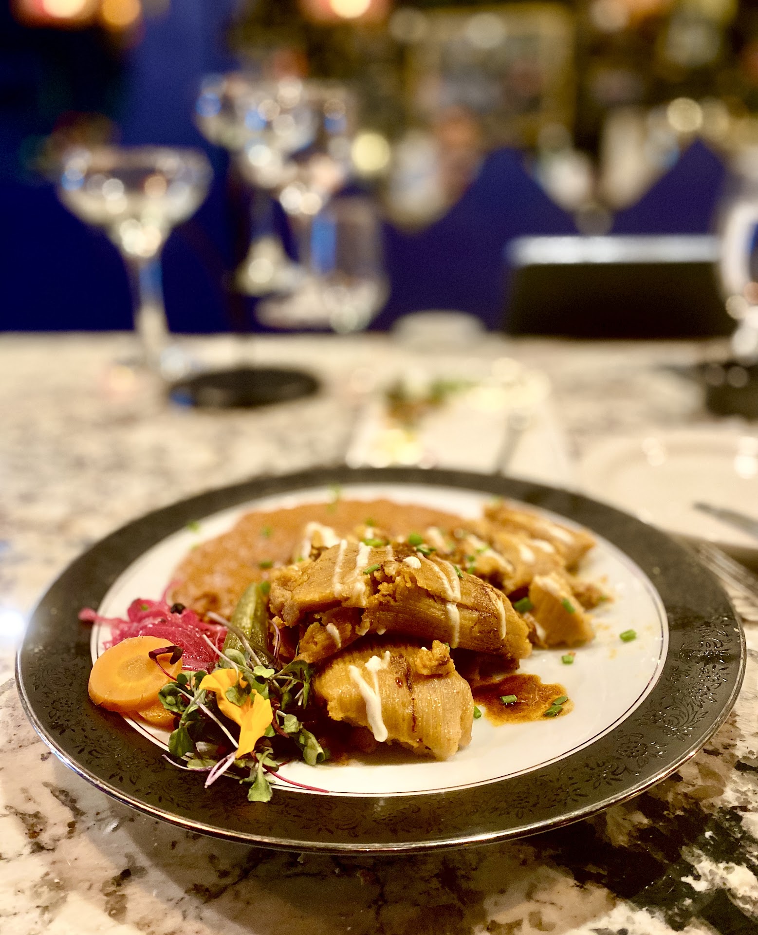 It’s in a very odd place in Rocklin and obscure strip mall very unassuming from the front of the building …once you walk inside you were taken back to a speakeasy type vibe. Low lighting, red velvet chairs, and sofas very nicely done. we were greeted very promptly and seated. The waiter was super nice. We met the owner. Very lovely lady.