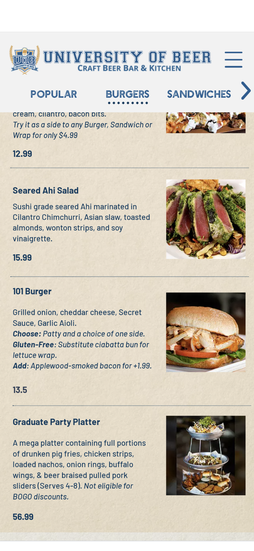 Food/price point - Pro: Loved the Mango Habanero Fish Tacos! Perfect amount of heat and crunch. Would recommend that for sure. Great price point for the meal. Husband enjoyed the 101 burger, but said it wasn't amazing. It was cooked well and the fries were crispy, but we've definitely had better. Con: We were NOT thrilled with how easy it was to miss the upcharge for beef on the menu. When ordering a burger, one expects the price listed to include the beef patty. Usually it is the substitutions that increase the price. If the chicken is included in the listed price, make it a chicken sandwich with the option to change it to a burger at an additional charge. Don't list a price for a hamburger next to a picture of a hamburger, but then upcharge for the burger patty. Additionally, the server did not confirm which protein we wanted nor did she mention the upcharge.