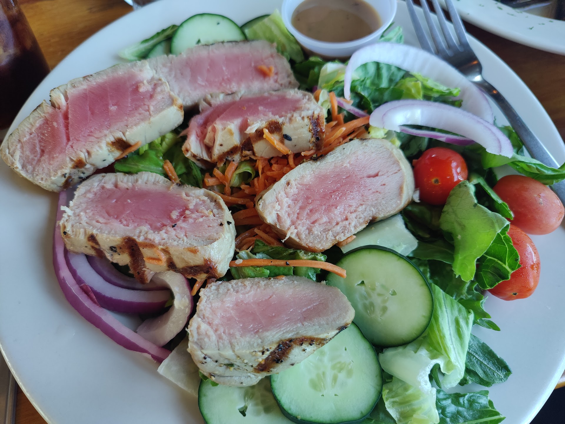 Read moreUPDATED REVIEW: thanks for reopening the upper deck…this is why we have returned recently with a large group of friends. Unfortunately, even with the beautiful views we will not be returning. We have given this establishment SO MANY tries and each time we are disappointed. The menu hasn’t changed much in years with limited options. Clam chowder was good but lukewarm which ruined it. Caesar salad had supermarket bought dressing (waiter offered this info!) and the fish and chips literally tasted like frozen fish. That’s a big NO NO in a seafood town. They served it with a side of tartar sauce literally in a plastic peel off…pic to prove. C’mon simple thing to make homemade!Swordfish sooo fishy and the curried shrimp was mediocre. The fried shrimp “platter” had 5 (yes 5!) shrimp on the plate with cold fries?? First time ever seeing this at any restaurant in vicinity. Oi…Sorry but management needs to step in and step up here. Saving grace will always be the views on the top deck though.