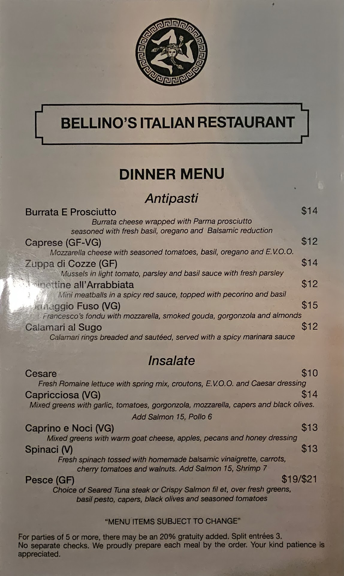 Our appetizer was calamari, and (brustta, you have to ask for it, not on the menu). Suggest asking for a side of balsamic vinaigrette to drizzle on it. Francesco (fetticini alfredo). The chicken had a nice sear and still moist inside. The other dish was with shrimp đ€. Both dishes were perfect, side salads and for dessert we had the tiramisu. The table next to us had a canoli, and đ Mmmm, next time, I know to order one of each and share both so we both are not found wanting. If you have been thinking about trying Bellino's, don't put it off. Make the reservation and have a great dining experience. If this helps you please...