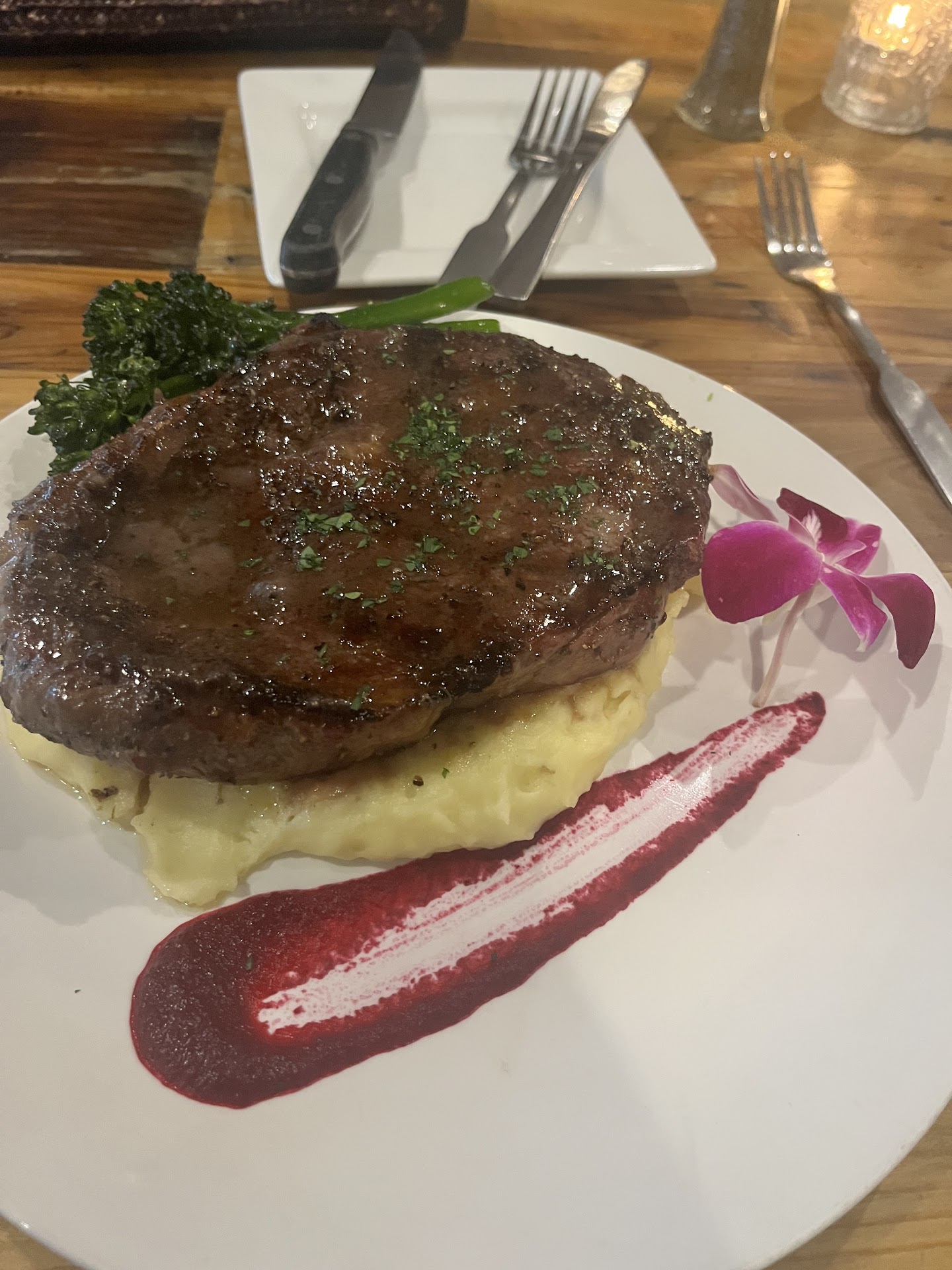 I ordered the ribeye with tallow butter, and I highly recommend itâthe steak was tasty and incredibly tender, although it was slightly undercooked despite my specific instructions. My husband ordered the salmon, which he found to be tasty, but was disappointed by the smaller-than-expected portion. He also didn't like that the bacon-wrapped green beans as a side were quite small. I shared my broccolini with him, and he enjoyed the potato purĂ©e; while my potatoes were a bit different, both were delicious.