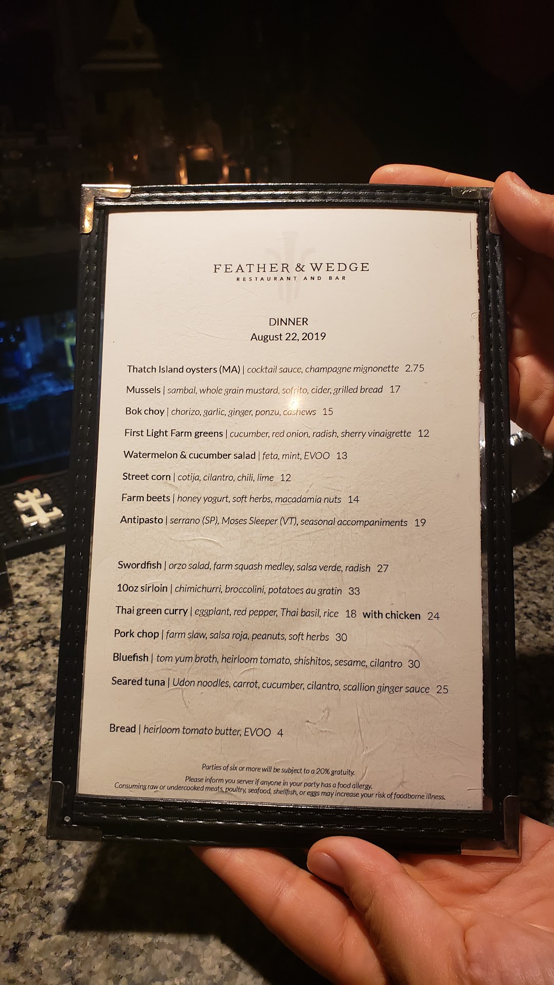 Read moreWe are transported Rockportians. However...... We come from the NYC area in the past. So, in order to review the much anticipated Feather and Wedge restaurant we would like to say the following: The decor was great; the bar offerings were great; the wine selection was limited but very good; the menu description was really fine (limited offerings at this beginning of their venture); there was a limited (limited is NOT bad) selection of apps, salads, mains and desserts. The limits, in my opinion, are a good idea given the fledging business. We ordered the beet salad, chicken liver pate, butternut squash soup, the flounder and the chicken thighs. The beet salad was true to beets (good). The chicken liver pate was OK --possibly too much liquor-- but needed seasoning. The squash soup was OK but not particularly delish (it didn't feel like "homemade" and should have been for 10$). The chicken thighs were OK but NOT NOT NOT special in any way. The flounder was tasteless, boring boring boring - fennel salad was fine but not anything to write home about (or Guy Fietti for that matter). The mains had basically little taste. OMG--- so sad and really sad in regard to the price. Rockport needs and WANTS an establishement that is more than just the plain. The waitstaff was really really good. The bartendress was great. The owners appeared committed but the FOOD has GOT to be better. Please. Please. Please. We can get mediocre in lots of establishements around the North Shore but we need FLAVOR and EXCITEMENT in our food. Please, please, please. We live here ALL year. We want to frequent this establishement for SO many reasons but will not pay the prices for boring, boring flavorless food. PLEASE!!!!! The place is gorgeous. Make the...