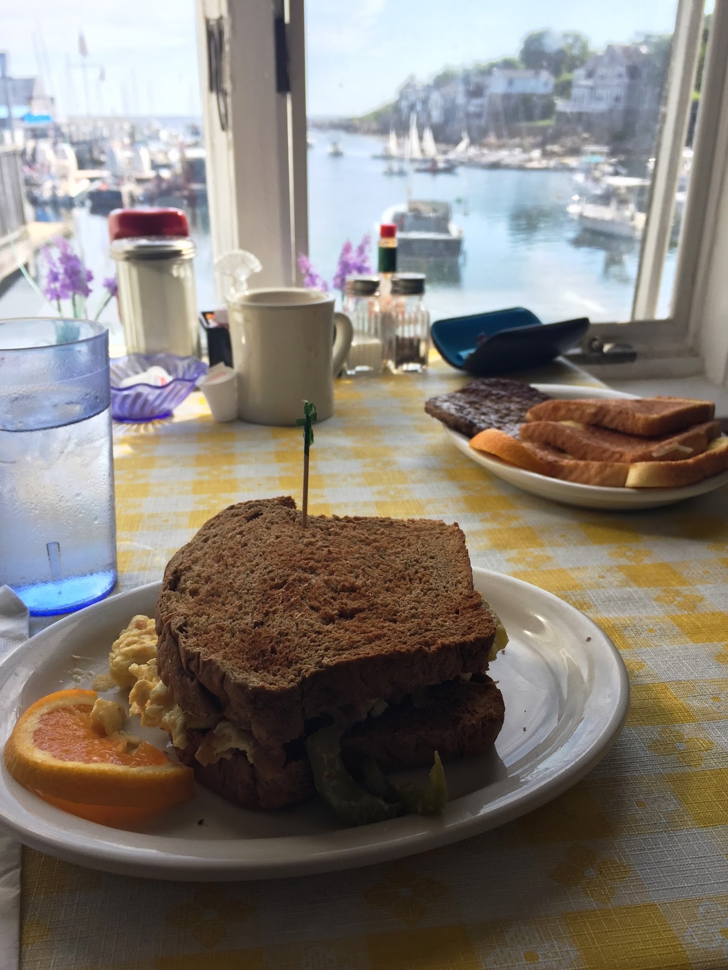 Without further ado, we took our breakfast a short walk to the nearby Tuna Pier where we sat down to unwrap and enjoy our breakfast...only to find that there was no top half of the English muffin on my spinach cheese and egg. Finding myself in crisis with no ability to eat the 2 fried eggs and three tiny pieces of shriveled spinach because no fork had been provided (this was no longer a sandwich), I further discovered that paying extra for mushrooms had yielded no result, as I could not find a single mushroom in my sandwich. Alas, all of the cheese had slid off of the sandwich into a pool, covering the single orange slice that accompanied the sandwich in it's sandwich size styrofoam containers.