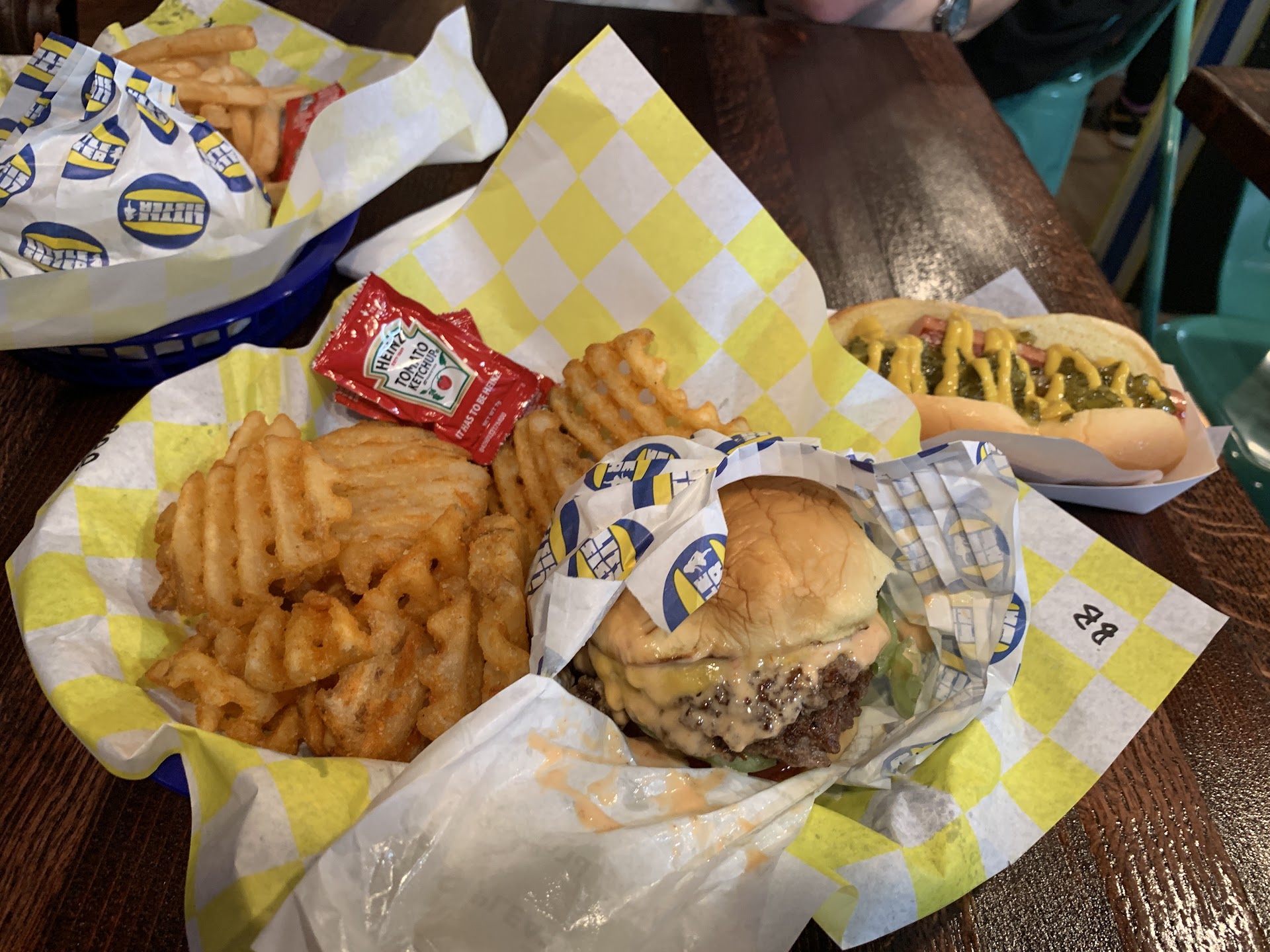 The last time we were here it was called TopDog. Now there seems to be less seating than before. Prices for 3 were over 50.00 (3 dogs, 1 burger, I onion ring 2 fries with 3 drinks)..The food: the hotdog was spectacular with a grilled bun except I asked for very little mustard. I guess their signature is to lace it like sneaker laces across the top. This adds about 1/4th of a cup of mustard to my hotdog. I needed to scrape most of that off with about 10 napkins. My friend got onion rings. The minute it was set on the table she reached for one and they were all stuck together in one clump. The batter was missing on1/2 of them. The whole batch was lifted when she plucked one up. Not sure what happened with these. This place is not handicapped accessible. I have a walker. Do not go in there with one! One of the servers rudely told me I couldn't stand in the middle after we ordered. I was just trying to fight my way out of the place around the crowd of people, servers, and many boxes of supplies in the way. If they didn't have so many boxes and boxes of supplies cluttering up the place it would be easier for people to move through. Would I go back? Yes. I'd leave the walker...