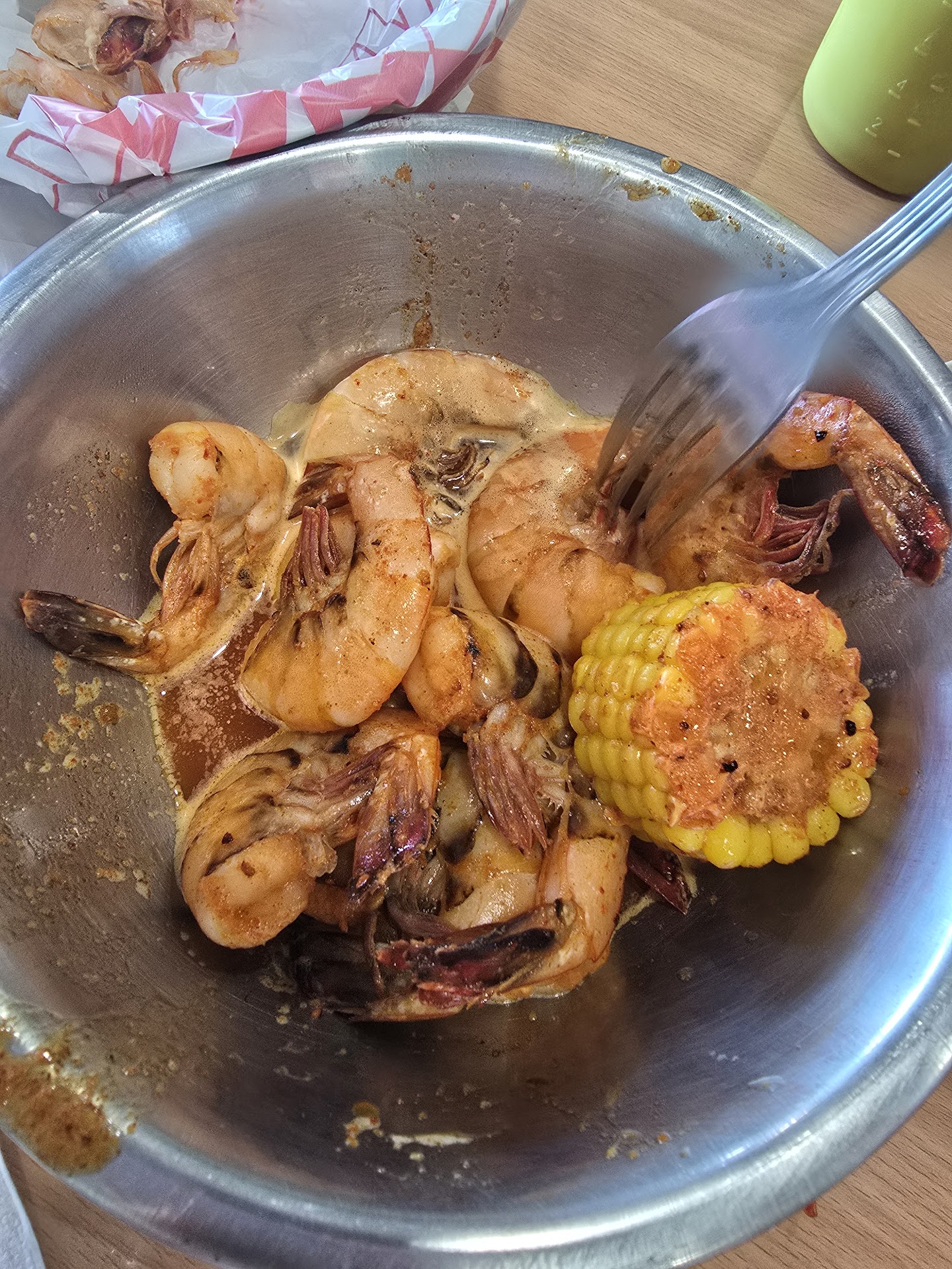 Start with the boiled shrimp. 1 pound of large boiled shrimp (shells on) served over spicy butter sauce with a potato and corn on the cob! Excellent flavor, just spicy enough. Jumbo rock shrimp. I definitely should have taken advantage of the plastic "bib" they offered.
