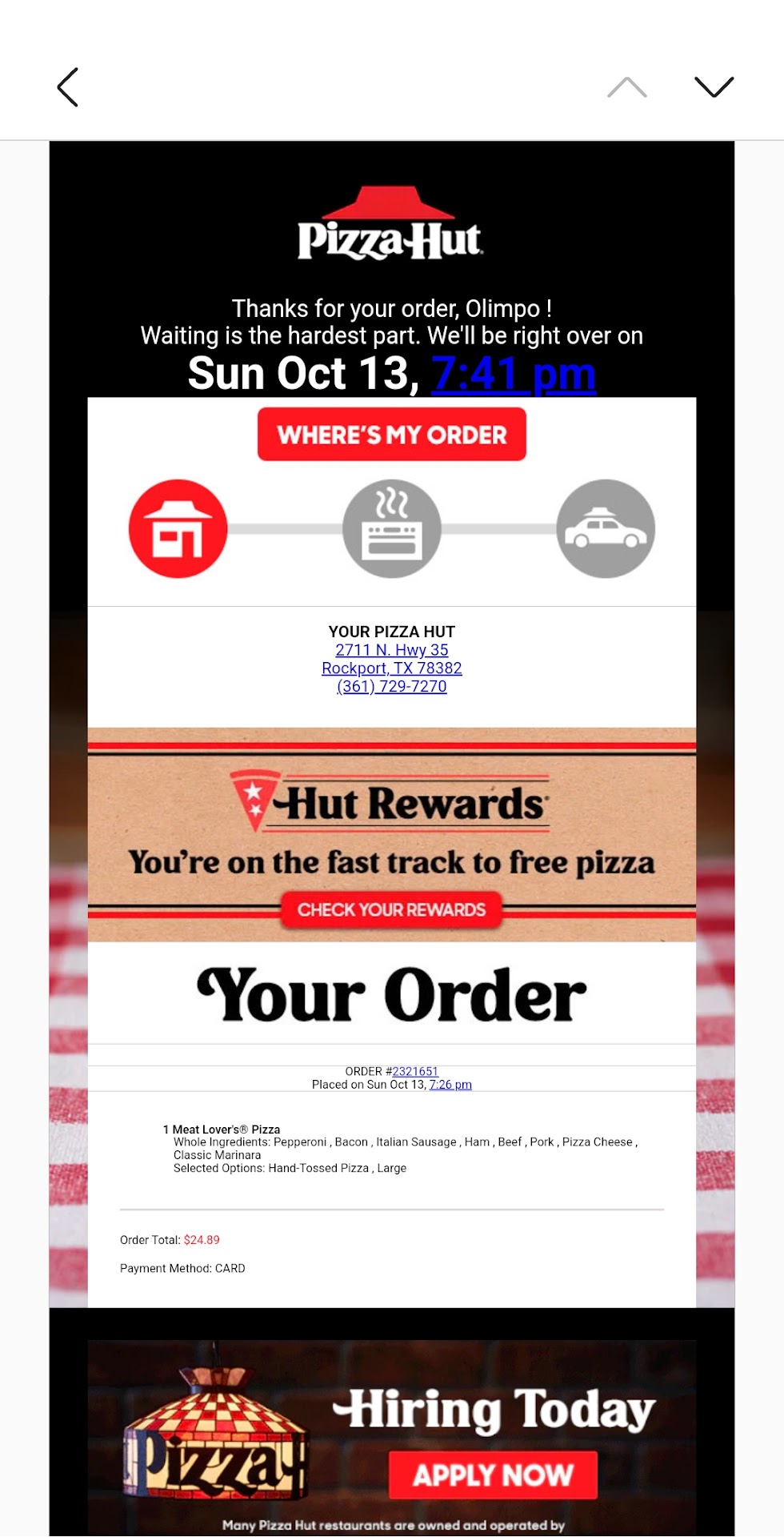 Read moreI am going to start this review off with if I could give this location -5 stars I would. It’s my son’s birthday and he loves Pizza Hut pizza and we were visiting from corpus so we figured let’s get him what he loves. It said it would be ready in 20 mins (which is normal). This experience was anything but normal. I pull up to the drive through line and I wait about 7-10 mins and the line never moved. I was thinking odd but okay I’ll go inside. What I saw when I went was more than 10 people waiting for pizzas. Most were for door dash. It looked like a dmv waiting area. I wait and wait and no one comes to the counter. So I popped my head around the corner and asked if I and another lady could be helped. Both of our pizzas should have been ready over 20 mins. Tyler Driver ( maybe a driver or a last name) comes up in a cut off shirt. Which isn’t professional in any food business due to armpit hair could fall on the food. I asked if I could get my order and he says we might have it we may not let me go look. Mind you the whole warm rack is FULL of food ready to be picked up/ delivered. I see him walk back and forth and going through every pizza to try to find mine. He comes back and says I could only find 2 of the 3 pizzas. Like wait what?!? I’m appalled. So I ask how long would it be to get my 3rd pizza and he replies I’m not sure the back is slammed. I walked out and got food someplace else. I understand people and businesses have bad days, but this is a chain resturant. It’s supposed to be stream lined. So I’m not sure where the lackadaisicalness came from but I would not eat at this...
