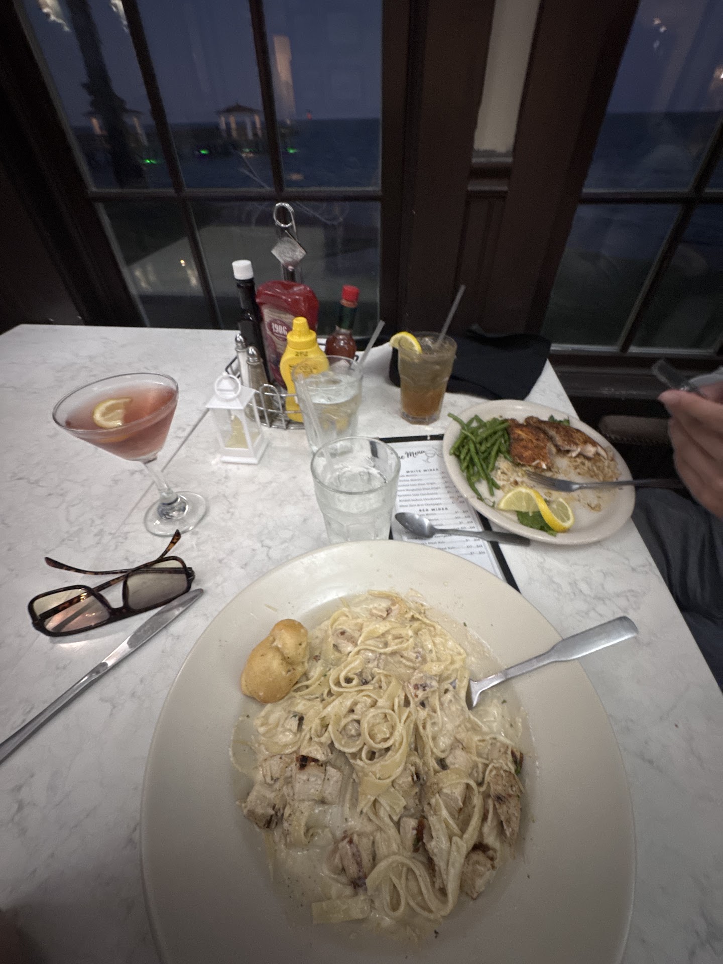 Read moreWe are staying at The Lighthouse and decided to have drinks at the bar then dinner at The Palm Room. Mark was our friendly bartender/server who did a grand job with our meal. The Crab Poppers appetizer was excellent and we followed up with the Jumbo Shrimp platter for Deb and the Shrimp and Redfish platter for me. Both were perfectly cooked, goodly portions and well presented. And the French fries were the best I have tasted in years! You really cannot beat local Fresh Blackened Redfish and Jumbo Shrimp perfectly cooked. Deb had the Sauvignon Blanc and I the Voodoo Ranger Juice Force IPA to wash it all down. All in all a great meal for a very reasonable price. Unfortunately, we were too full to try one of their...