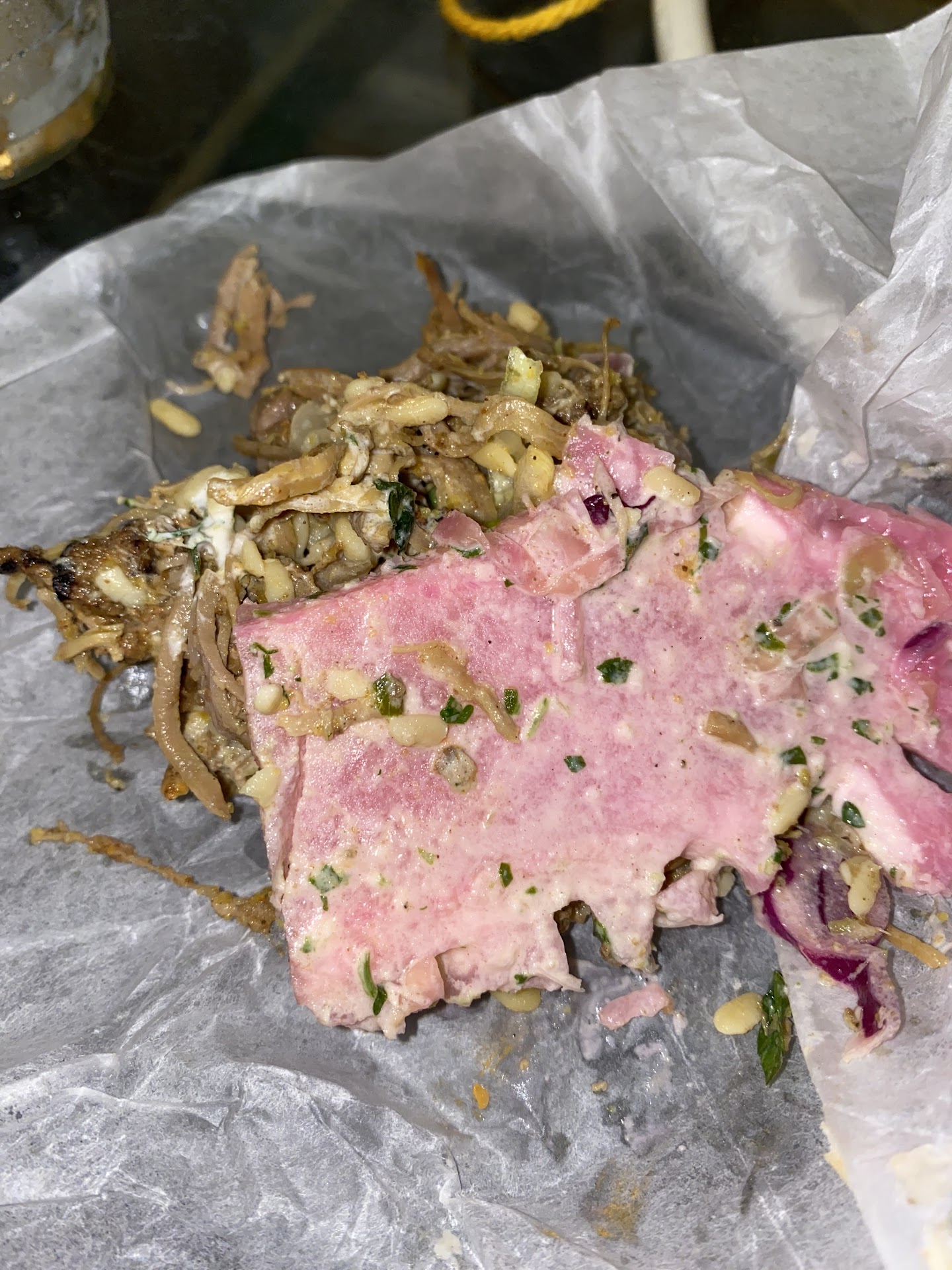 However, I get home, open my bowl to enjoy a what I thought would be a delicious meal, and realized there was lamb or some other meat (along w/ chicken) in my chicken bowl. It tasted weird overall honestly & then there was a large random pink radish(??) or pink-vegetable-stalk-looking thing as well. I genuinely don’t know what it was. (Pictured) It’s not an ingredient on the menu and I honestly feel dumb for not knowing what it is? But, like !?