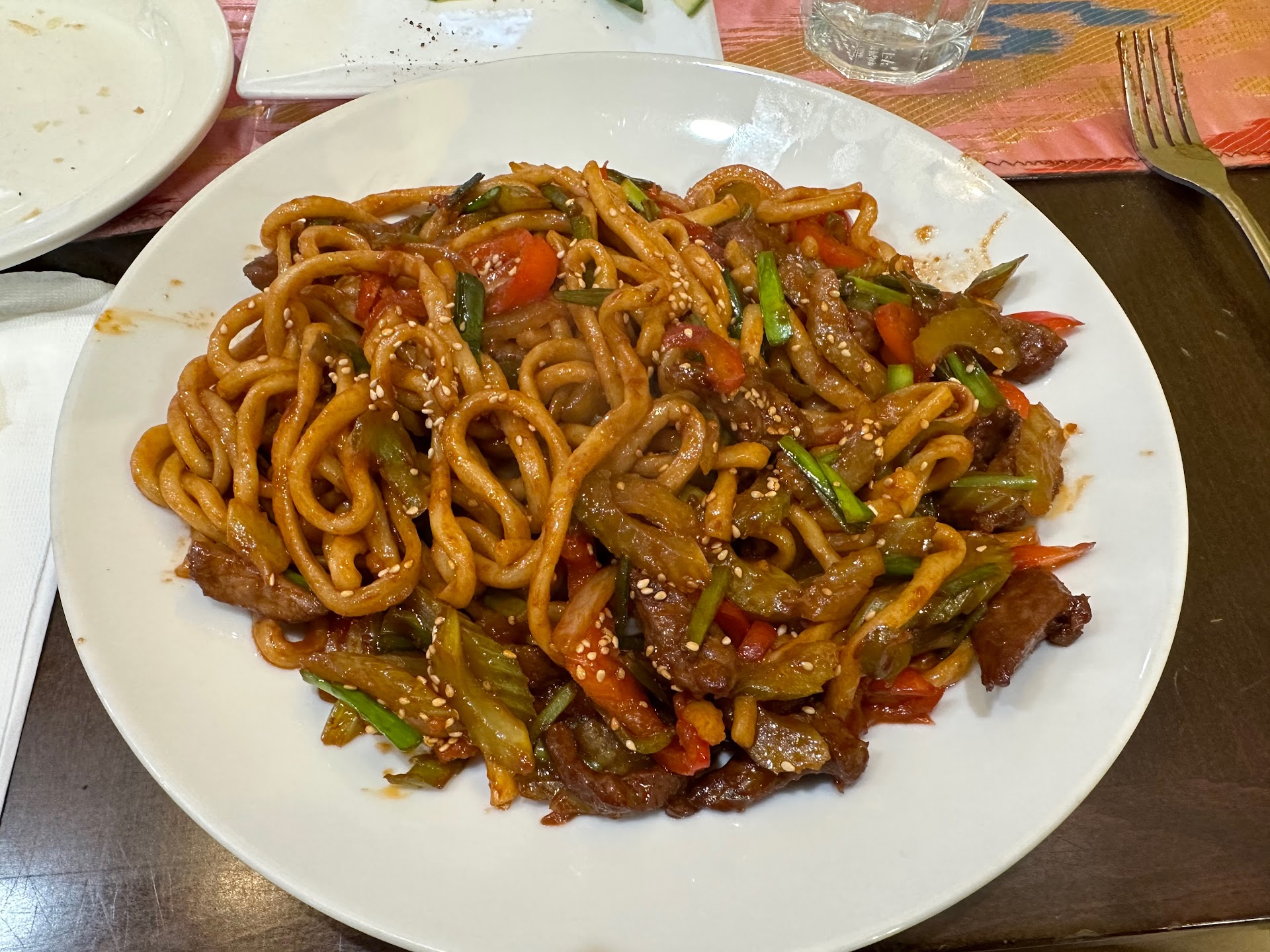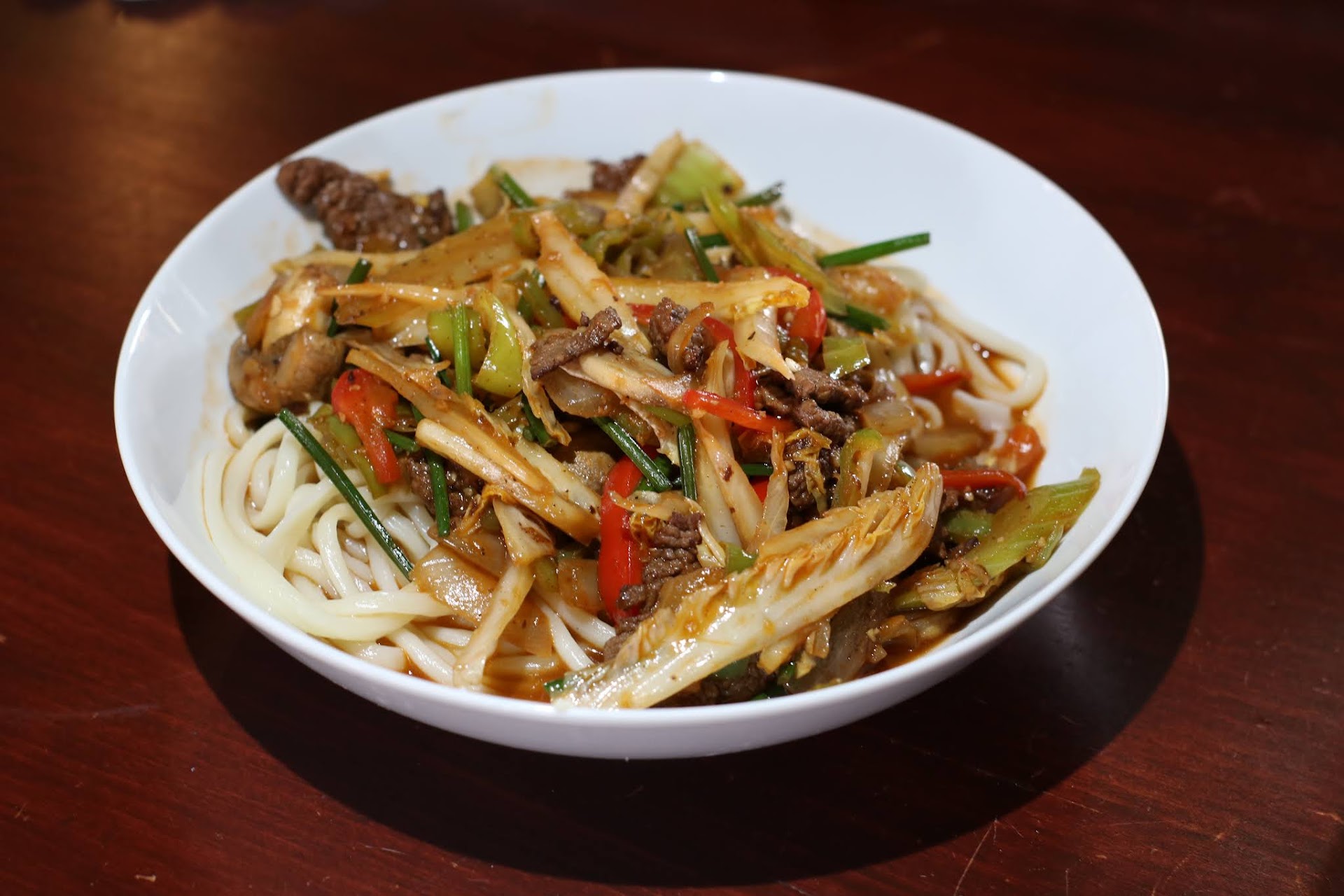 Entrees: Gambian Soman (pictured): I would fall asleep in a bed made of these noodles. You will never settle for lo mein again. Thick (udon-like) noodles with veggies and an incredible sauce. I've also ordered the chop fried soman before, which I believe is the same dish just with the noodles chopped into one-inch lengths, which was equally as amazing, just slightly different eating experience. Gyro Laghman: Very similar to the Gambian Soman except in more of a soup-like sauce....