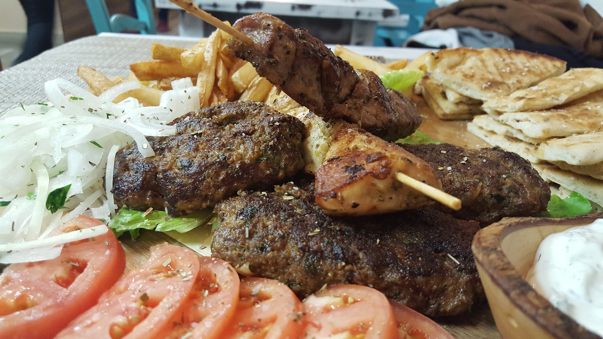 Service was quick and we were quite happy with the food. It was a big plate with generous portions of Lamb and Beef gyro, one burger, sausage, skewer of chicken, lots of pita bread, a bucket of fries, with onions, tomatoes, and tzatziki sauce.