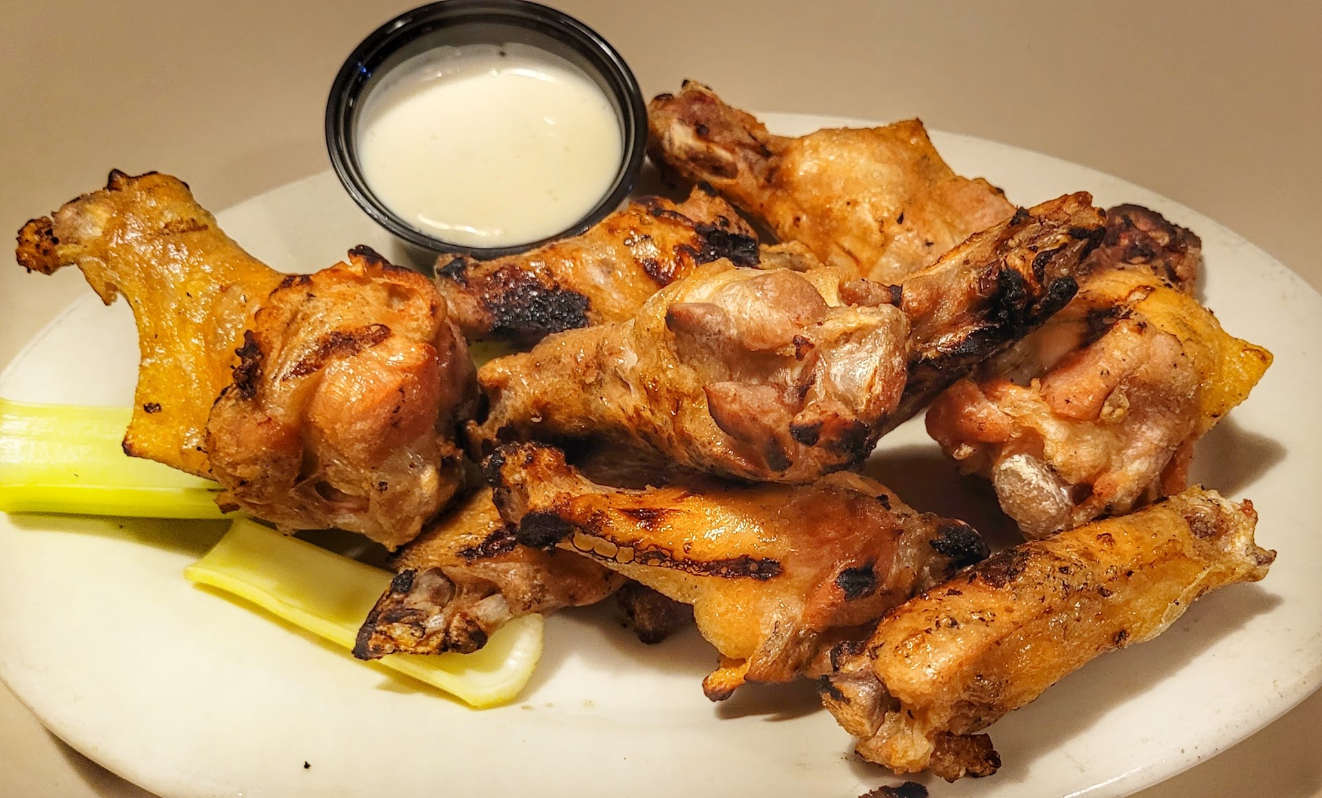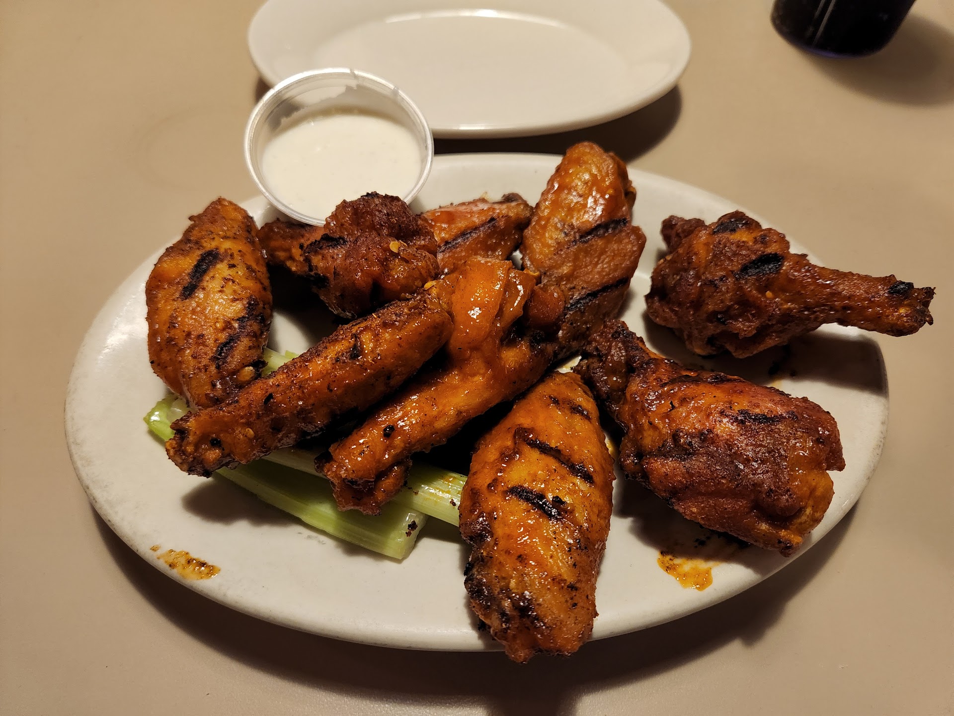 My friend absolutely loves their grilled wings so I decided to give it a try, I got naked wings and let's just say it was not good. There was no flavor to the chicken, it was tough and over cooked, I honestly couldn't eat it, but the staff was so nice I didn't say anything about it. My friend still loved their wings but they like over cooked chicken and I do not. I also don't like char flavor which these have. The wings are also served with blue cheese.