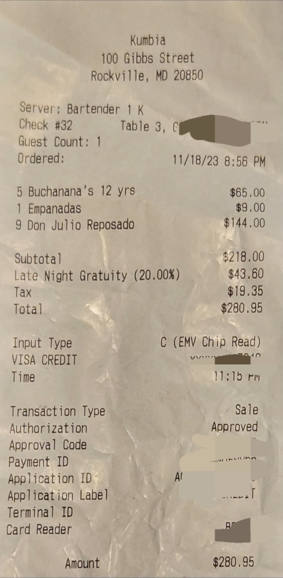 I was on a busness trip and decided to check out a couple of restaurants with good food, drinks and Entertainment. Which next month I would be taking out my clients for the Holiday's. When a travel I use Google review to assist me in locating good establishments. I found Kumbia on Google, The reviews were good. I decided to visit the establishment Saturday night. I arrived and sat at the bar. John the bartender greeted me, John was very nice and attentive. I had a couple of drinks, I had Buchanan on the rocks with splash of seltzer. The drinks were watered down. I then ordered Empanada, The Empanada's test like they were cooked in oil that has not been changed for a while. I could not eat the other Empanada. A short while later two more bartenders arrived Javier and a girl (I did not get her name). John was move the the other side of the bar. Javier was my server. I used the restroom and when I came back the bar stools where gone. Javier explained that the night life was about to start, and they remove the stools from the bar. I asked Javier for a shot of Don Julio, I also asked Javier if he and the co-worker (girl) would like to take a shot on me. They both said yes, Javier served 3 shots. We drank two rounds of shots, but I noticed the Javier and his co-work wrapped there hands around the plastic shot cups and drank it very quickly and tossed the cups out quickly. I am used to taking shot with bartenders and everyone would place the shot cup on the bar or table to show that you took the shot. I later introduced me self to some females that were Standing by my side at the bar. I noticed that Javier did not like me talking the girls due to his face expression. I was not feeling the place any more so I asked Javier for another shot and the bill. Javier asked if I was inviting him and his co-work also? I replied yes, I'll invite you guys to a shot. Javier served 3 shots, This time I paid close attention them when they were taking the shots. They again wrapped thier hands around the plastic shot cups and maybe touched there lips and tossed the shot cups out. They clearly were not drinking the shots. I gave they 3 shots each that I paid $16 each, To have them just throw the shots out. But it could not get any worse, but its does. I hand my credit card to Javier, the bill was $280.95. They also include a 20% gratuity after 10pm. Javier turns around yells to me that my credit card declined. I am sure that I was not the only one at the bar that heard him. I asked him to try the credit Card again. I have been using this card during my trip and have not had any issues with it. Javier yells again that "the credit card declined". Javier never gave me any recept stating that the credit card declined. I gave Javier another credit card. Javier again yells " This credit didn't not decline ". I was very embarrassed!! I took my last shot and I left. I went to another establishment that was walking distance. The second establishment was a better experience. I also used the credit card that Javier stated was declining. The next day I looked into why would my credit card declined. To my surprise my credit card never declined. So he charged me twice, Total $561.90. I have spoken to my credit card companys and explained to them my situation, and they are taking care of this issue. I do not like writing bad reviews, but no one should have to go through this, very embarrassed, humility experience like I did. I am a very understandable man owning 8 business, but management needs be address and or address these issues at thier establishment. I DO NOT RECOMMEND...