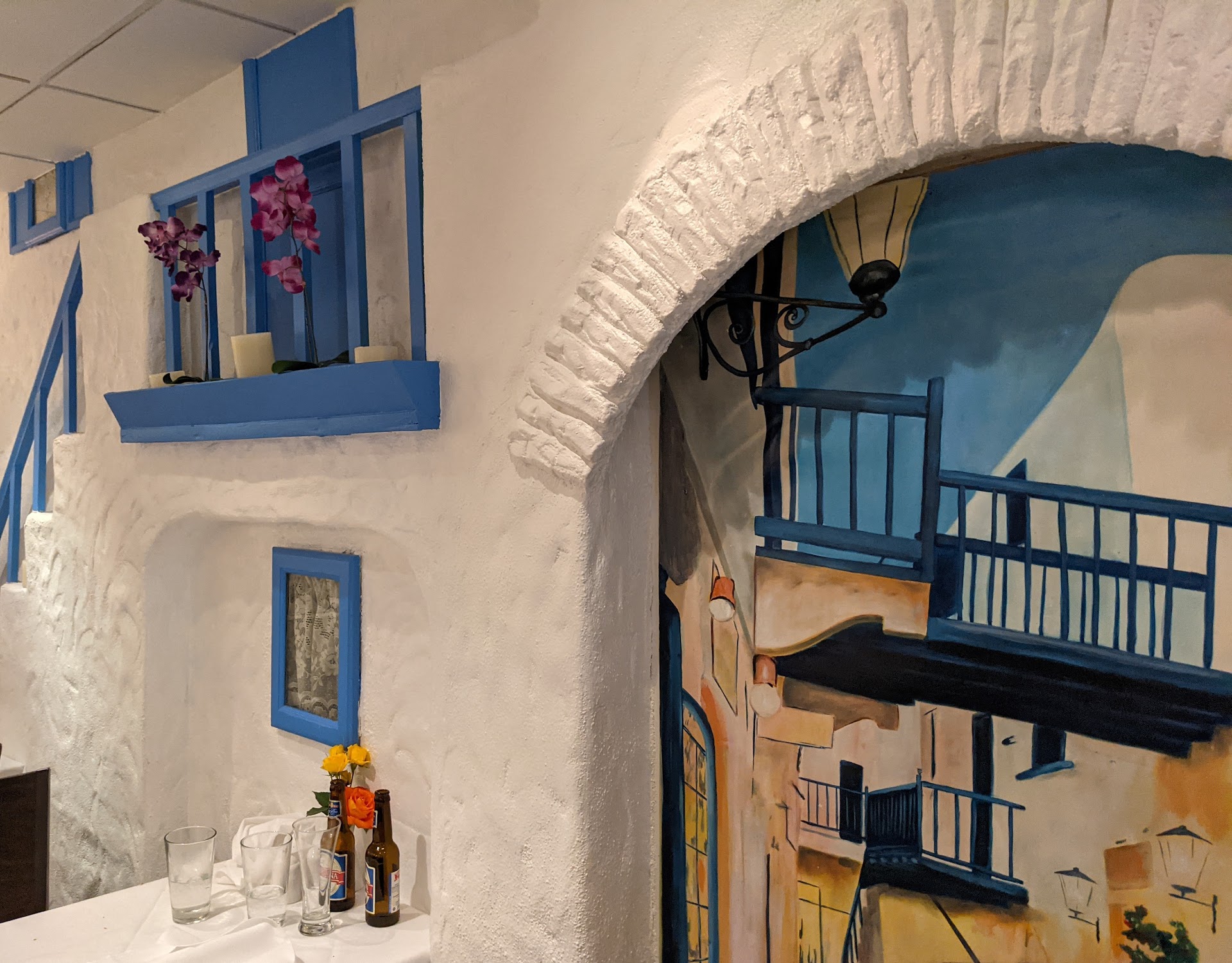 The atmosphere is nice, a semblance of the white city itself. Aestetically blue and whites, with red roses on each table with the servers dressed in white button downs and black pants. The Mykonos city motifs that are designed into the walls give an "essense of" feel without feeling too gaudy.