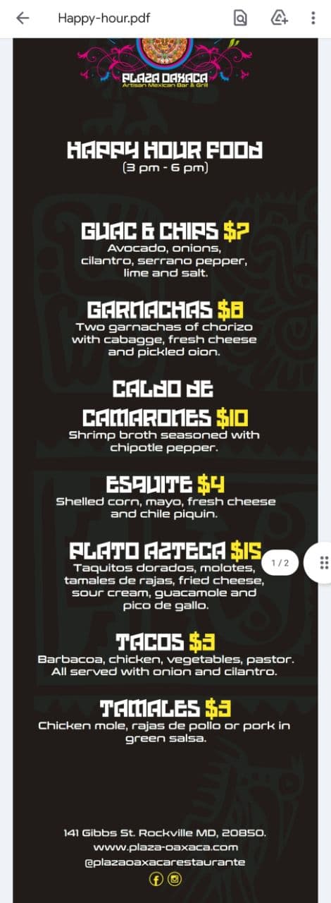 Read moreI'm giving Plaza Oaxaca kind of a "meh" review- hence the three stars. There were highs and a lot of lows. Service was pretty good and the ambiance is very much a party atmosphere- especially with the outdoor seating. We ordered the classic margaritas which were tasty but small and served in a 10 oz. rocks glass for $10 each. In other places that would be a $6 drink for that size. The Mahi-Mahi fish ceviche was good and properly executed. Next came the Chile Relleno with red sauce- don't order the red sauce. It tasted like the cheap, overly sweet sauce in canned spaghetti. No depth of flavor or heat or body. Thin and watery. The relleno itself was OK with a nice tender chile filled with chicken, but the chicken was boring and needed seasoning. Next came the chicken enchiladas with mole sauce. Don't order the mole sauce. This was one of the poorest excuses for a mole that I have ever put in my mouth. Bitter with no depth, no heat, no anything. Just bitter. I have spent a good portion of my life traveling the Southwest- Colorado, New Mexico, Arizona and Utah. If a restaurant tried to pass this mole sauce off in one of those states, they would be laughed out of town. This is so sad- it could be so good. Right now with the warm weather the outdoor seating will carry them. But when cold weather comes and that closes- well we will see how...