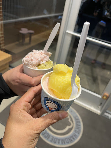 Pictured: Double scoop (left)- classic pistachio and rose pistachio 1/2 and 1/2 scoop (right)- lemon sorbet and rose pistachio Flavor wall- on 3/11...