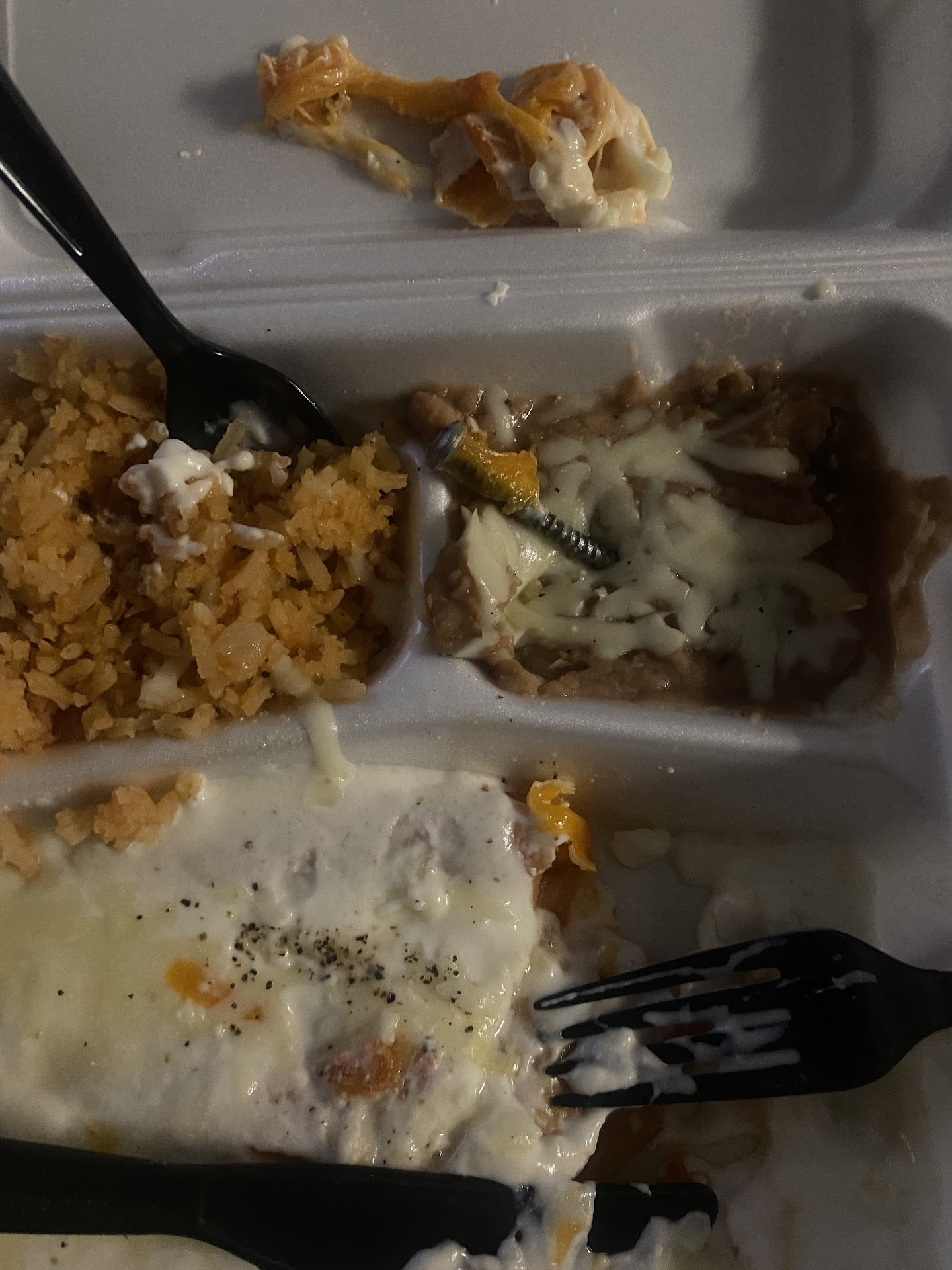 Food Review: Both dishes had very little refried beans and very little rice. The rice was nice and moist, however, minimal flavor. Rice was very bland. Refried beans tasted good, but nothing special about the flavor.