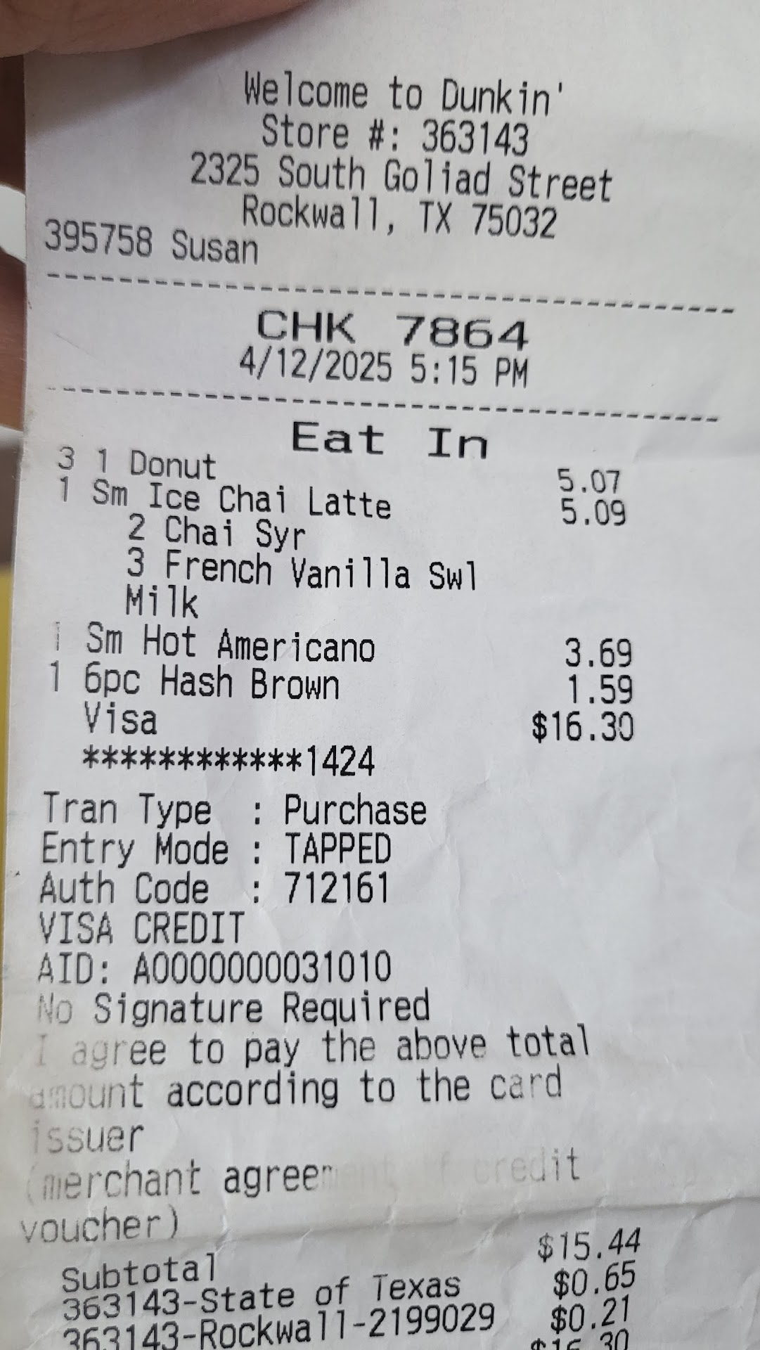 Read moreMy first visit was on 8/16/2019. I usually always go to the Dunkin’ Donuts on Centerville Rd in Garland, but due to the convenience of my morning commute, I decided to switch to this location. I always order using the Dunkin Donuts app, and today is the THIRD time that I’ve ordered, and each time my order has been incorrect. I always order a dark roast, iced coffee with cream, no sugar and hazelnut flavor. Every time I go to pick up my order, and try it, I have been given the regular roast coffee. I don’t have time to tell the staff to fix it, because I have to get to work, hence the reason why I always order via the mobile app. Today, I went to pick up my coffee, and it wasn’t there because someone picked it up on an accident. I see why: The staff there is not labeling the cups with the receipt that prints out with the customer name. The worker apologized, and promptly made me another coffee, and once again, I was given regular roast coffee, when the order receipt clearly says DARK ROAST. So I’m being charged for something that I am not getting. This is unacceptable. The point of the mobile app is so things like this don’t happen. If someone orders a certain thing, it should be given as ordered. I will not be coming back to this...