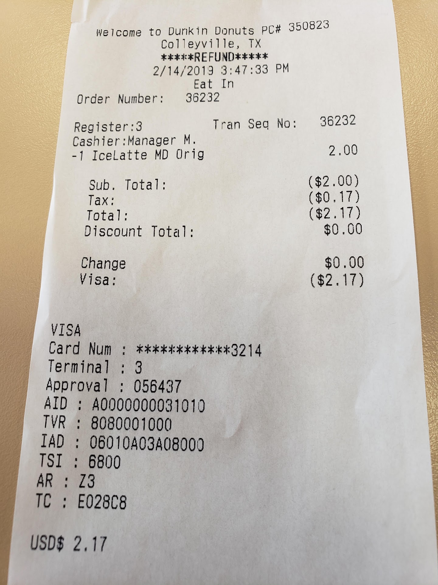 I am dissatisfied with the service that I received at your Dunkin Donuts located in Colleyville, TX. On February14,2019 at 3:30pm CST . My family and I decided to get some ice cream. So I ordered my daughter a single scoop of ice cream to go. However after finding out that they had no lids for the ice cream cup to go, we decided to eat it in store, only to find out they also ran out of spoons?! We ended using sample spoons to eat ice cream ( RIDICULOUS).Now before I ordered the single scoop ice cream cup I ordered a large iced latte. I waited, waited and waited (15-20mins). No latte. So I go back to register to let them know about it and the employee seemed HIGHLY aggravated with me for some reason( Probably because of the refund request). Without saying- "I'm sorry"...."I apologize"...."Is there anything we can do to make right"? Instead, in complete silence she takes my receipt and refunds my $2.00 and hands me a refund receipt and walks back over to ice cream section of the store and helps someone else. It's as if me and my family selecting your establishment and giving you my business MEANS ABSOLUTELY NOTHING. That was my 1st and last time at a Dunkin Donuts. The employees truly lack PROFESSIONALISM, courtesy and respect for customers. It is clear that they don't care because there is disciplinary action when they do. No views customers service as the life blood of a...